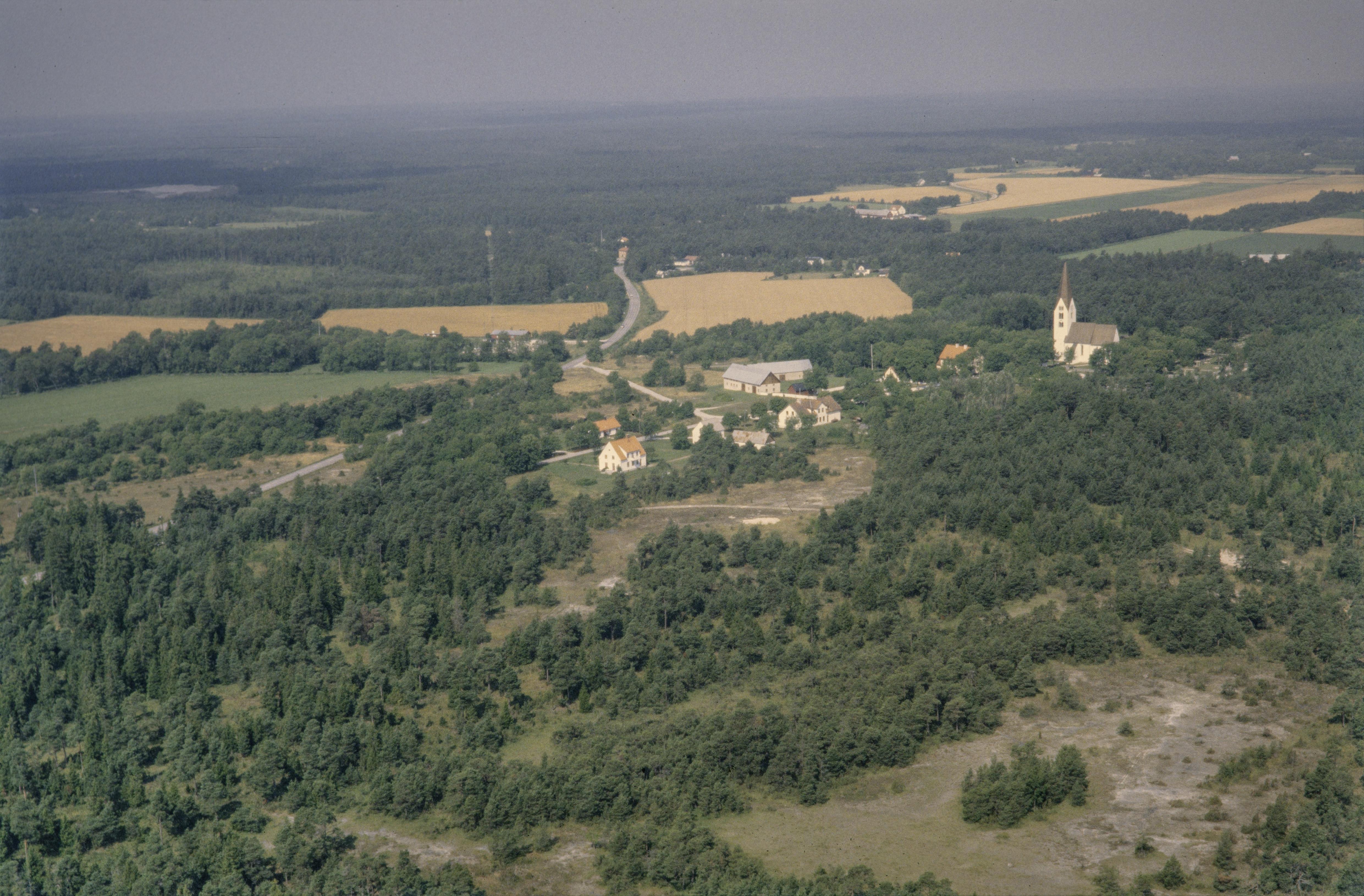 Othems kyrkby. Othems kyrka till höger om bildens mitt. I skogen nere till höger stensättning RAÄnr Othem 187:1. Bilden är tagen mot (väderstreck): NV Fotosyfte: Flygbildsdokumentation