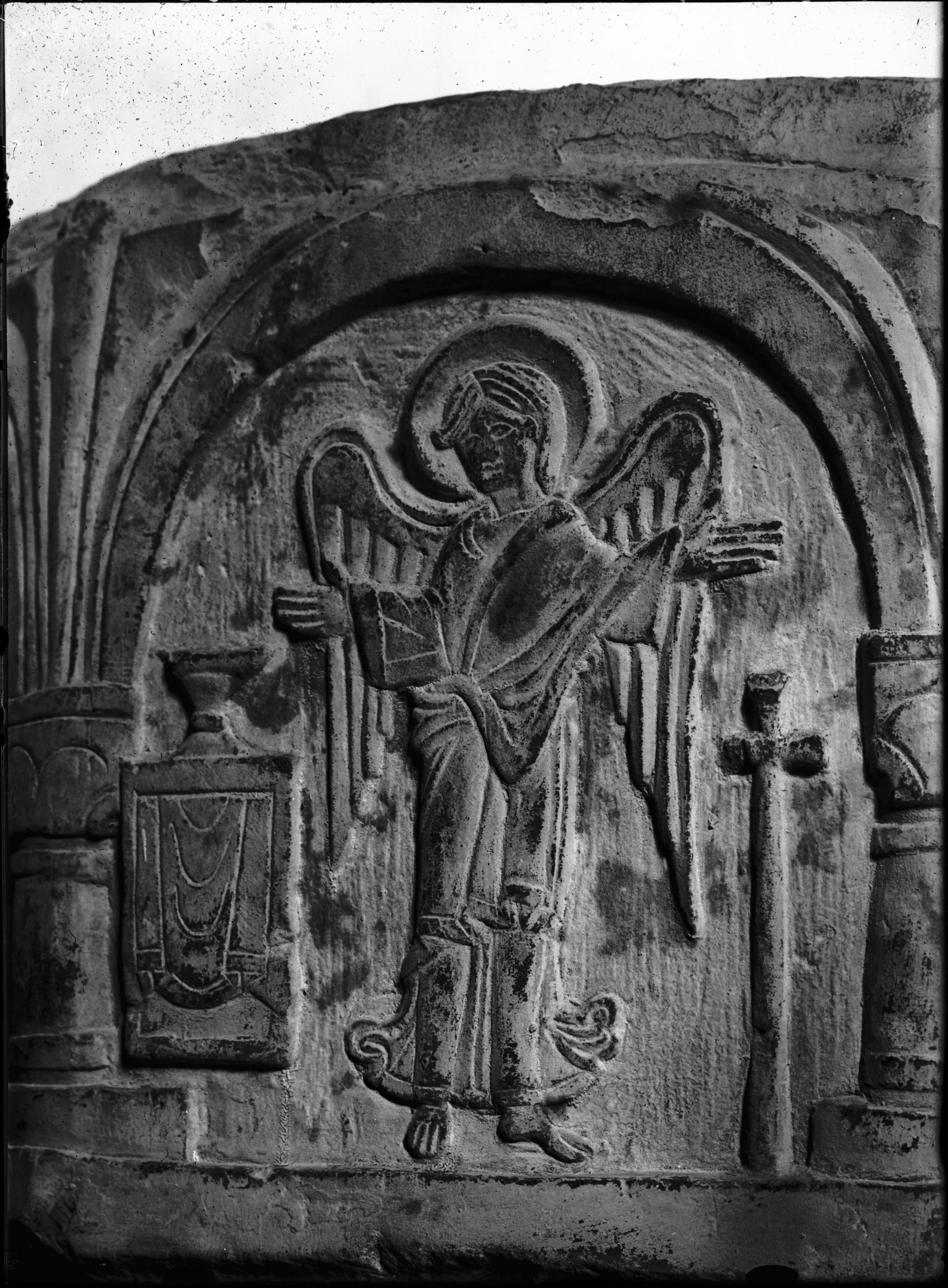 • Dopfunt av sandsten av Byzantois. Omkring 1100-talets mitt. Detalj av cuppans relief, ängel mellan altare och kors.