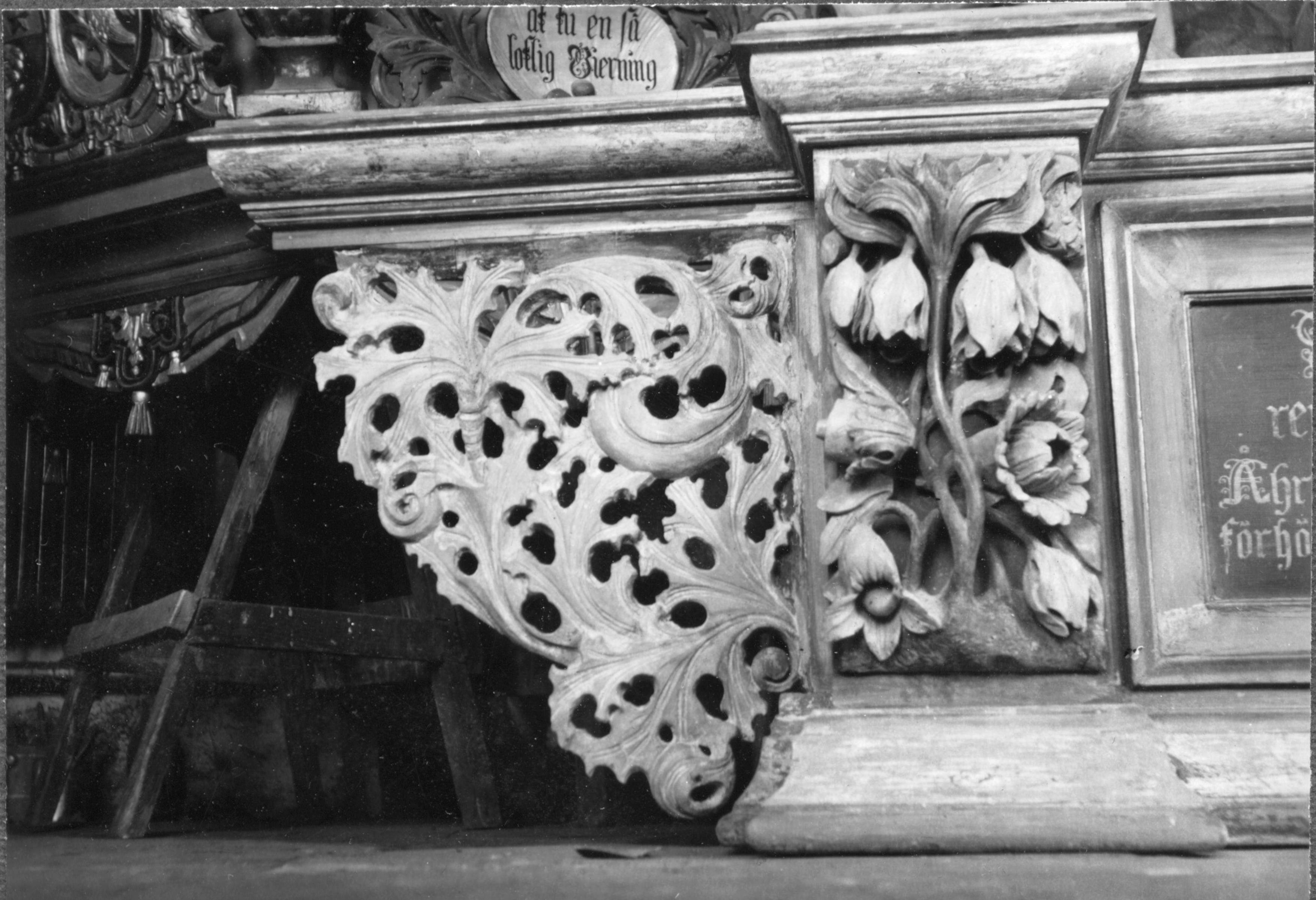 • Detalj av altaruppsats, före restaurering.