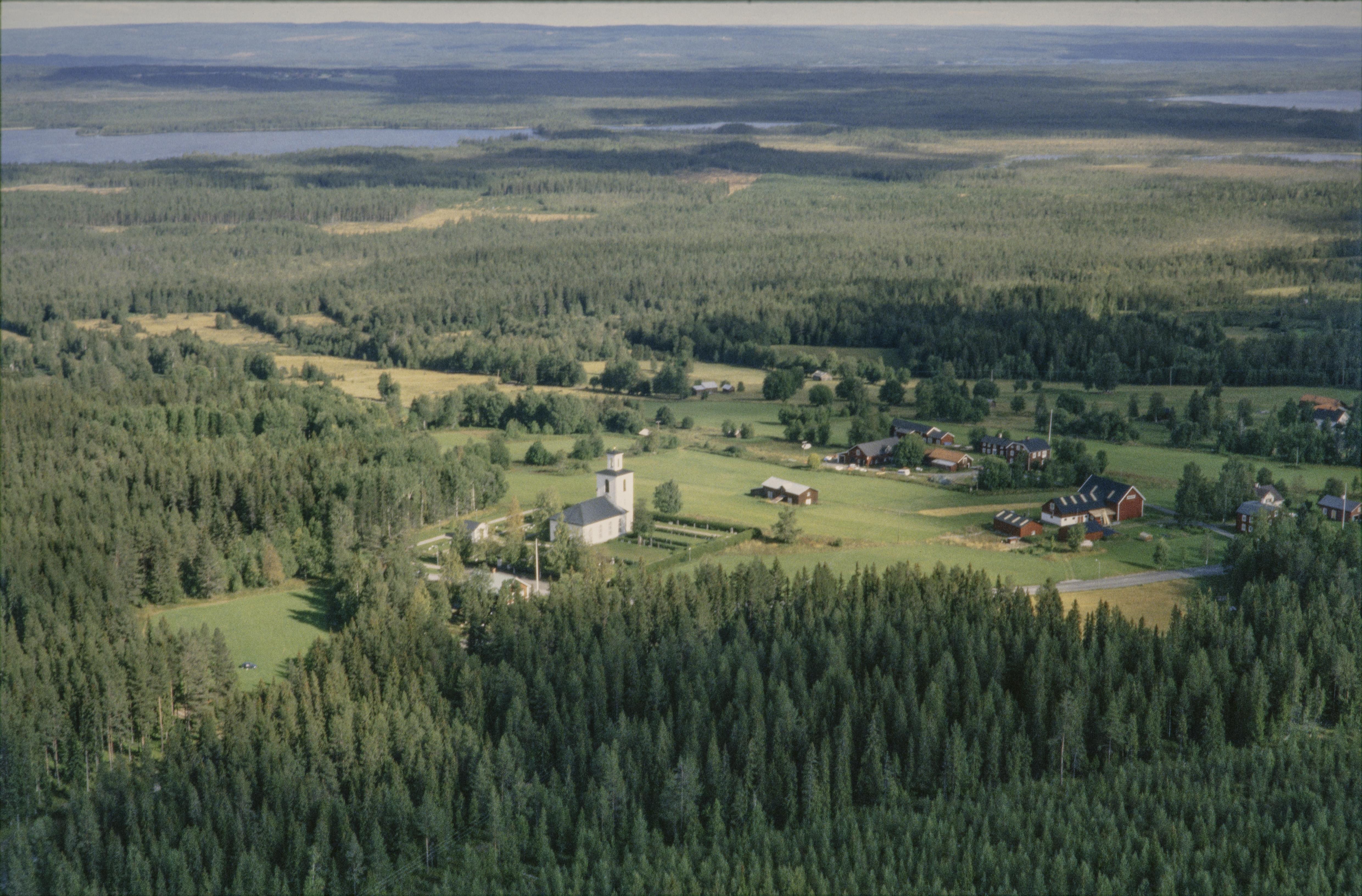 Kyrkås nya kyrka vid bildens mitt. Vid kyrkan bytomt RAÄnr Kyrkås 73:1. Mosjön uppe till vänster. Bilden är tagen mot (väderstreck): NO Fotosyfte: Flygbildsdokumentation