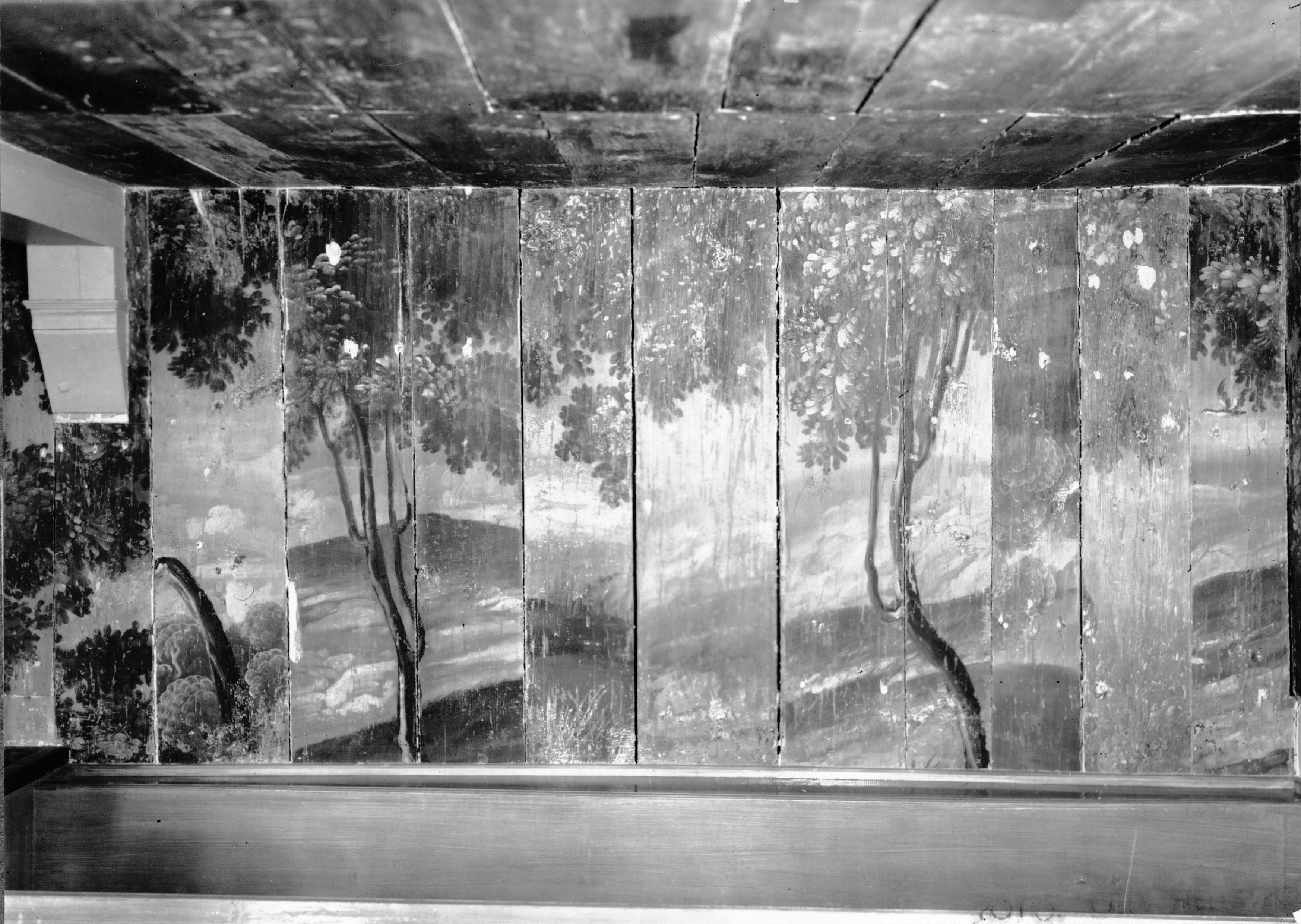 • Interiör mot väster, angående omflyttning av bemålade brädor på väggen under orgelläktaren, detalj. Före omflyttningen.