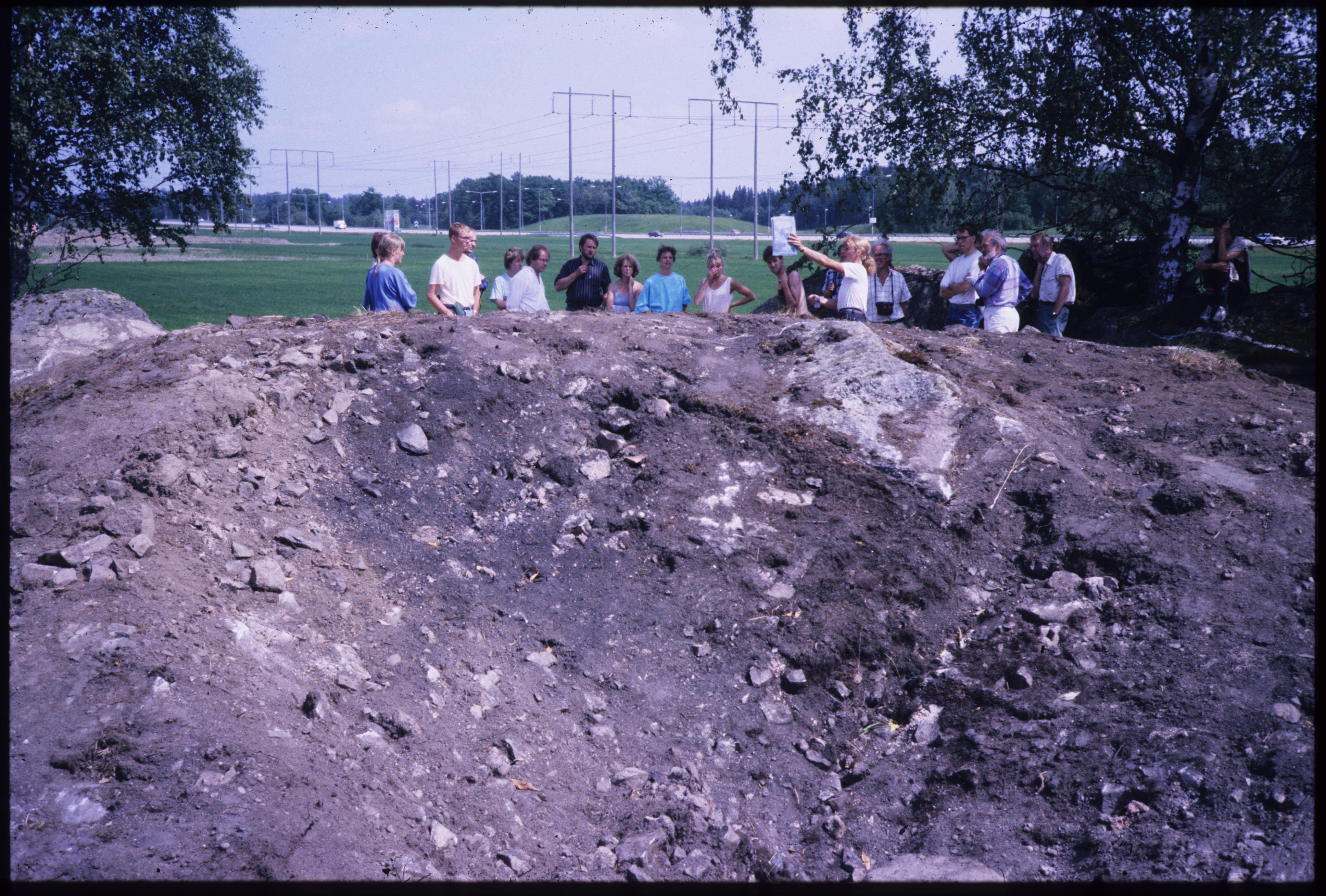 • Dingtuna 188:1. Skärvstenshög under utgrävning. På platsen idag är ett köpcentrum. Övrigt är det personal från RAÄ:s fornminnesinventering som är på exkursion.