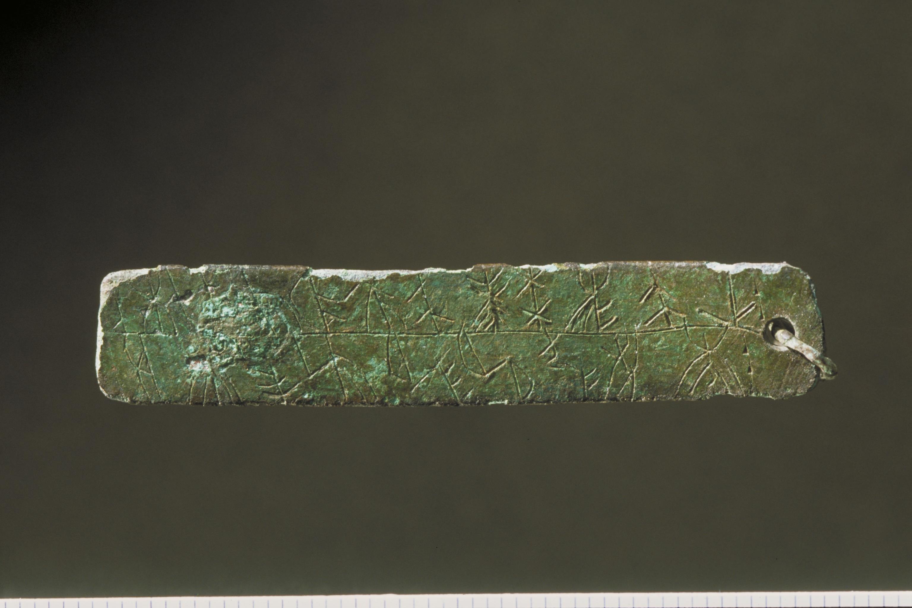 Bronsamulett funnen vid utgrävningar vid Alsnöhus 1993. Inskriften tycks delvis bestå av lönnrunor. Fotosyfte: Publicering