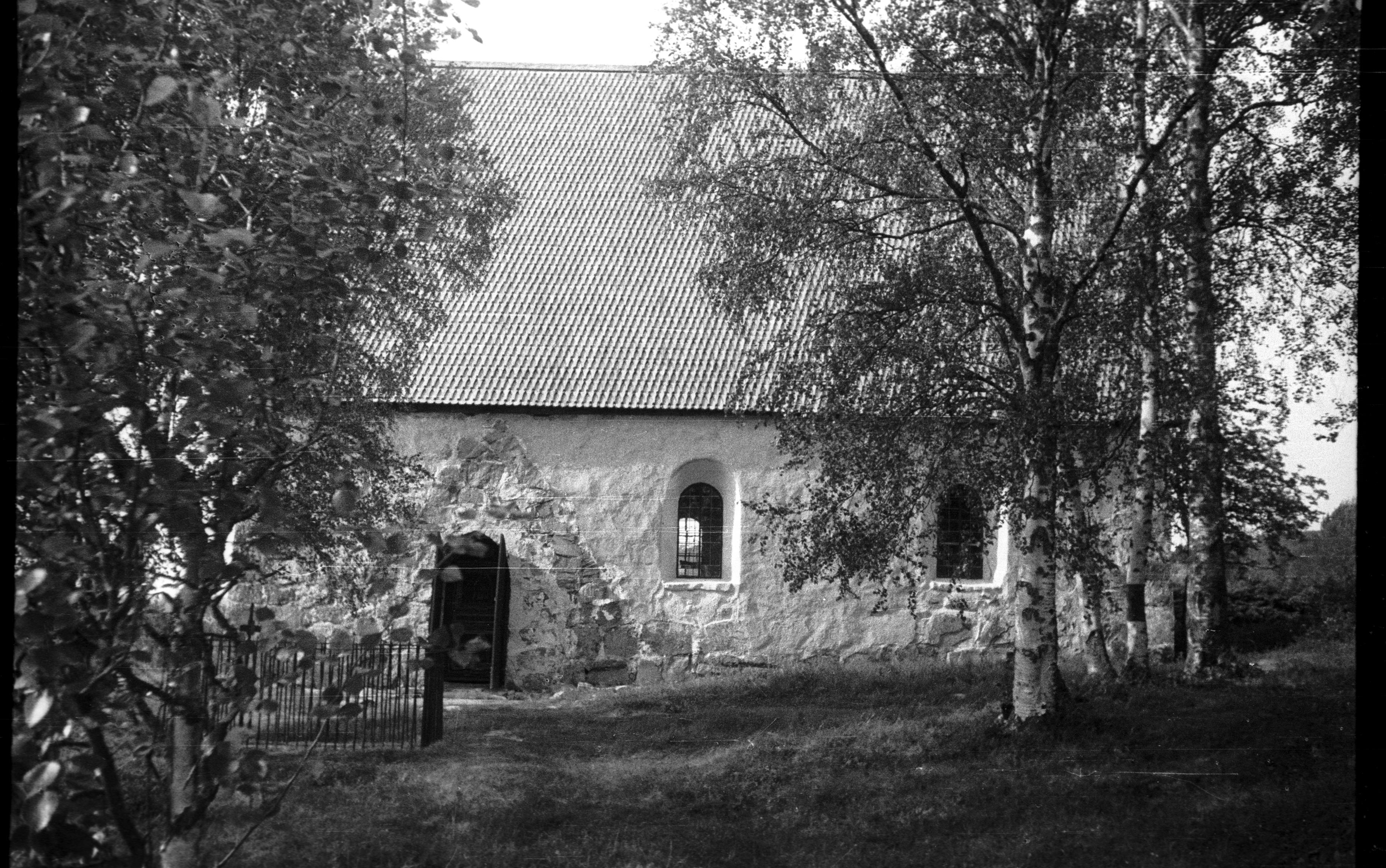 • Kyrkan från söder. Kyrkan är bygd i sten med inslag av den röda ragundagraniten. Den byggdes i slutet av 1400-talet. Stod sedan övergiven under 80 år och restaurerades och invigdes 1931. Indredningen går tillbaka till 1600-talet.