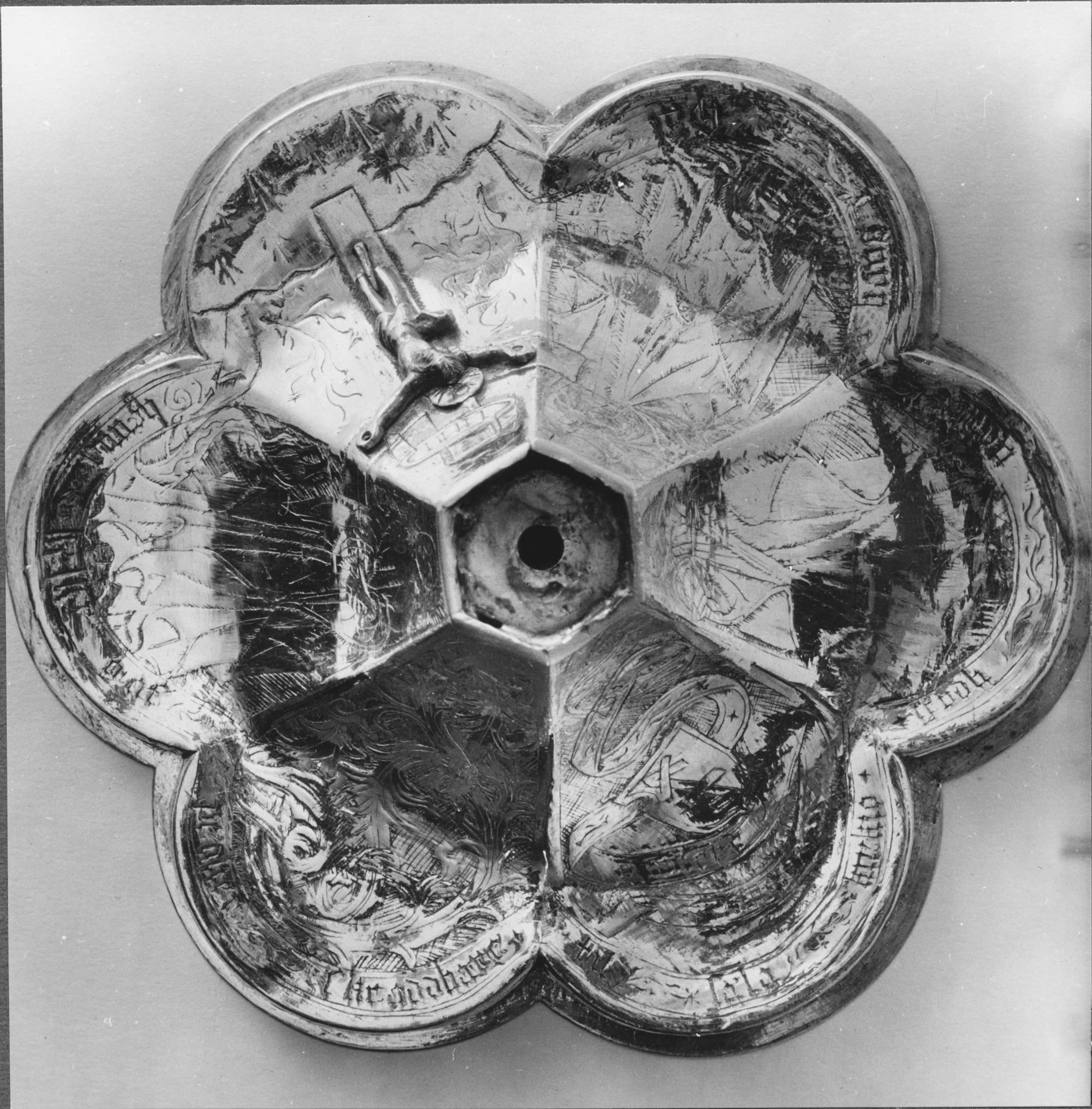 • Kalk av silver, förgylld. Detalj av foten, 6-passformig med ornering. Fastnitad Kristusbild på graverat kors. Graveringar.