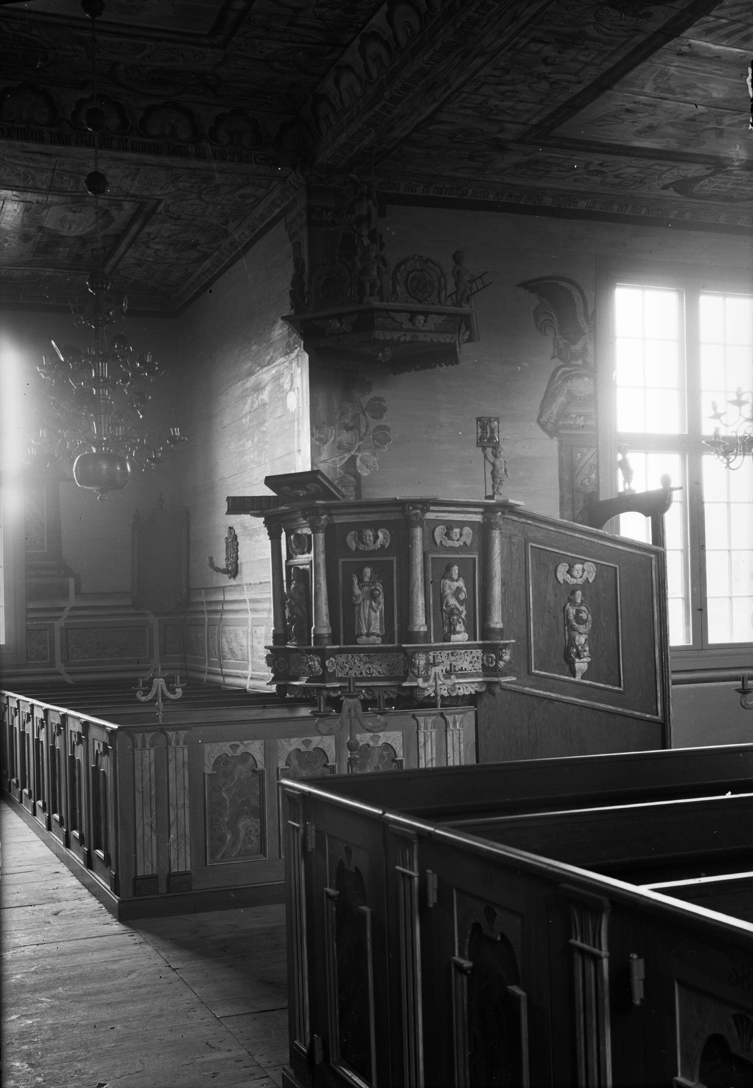 • Interiör mot nordväst, predikstol. Efter restaurering.