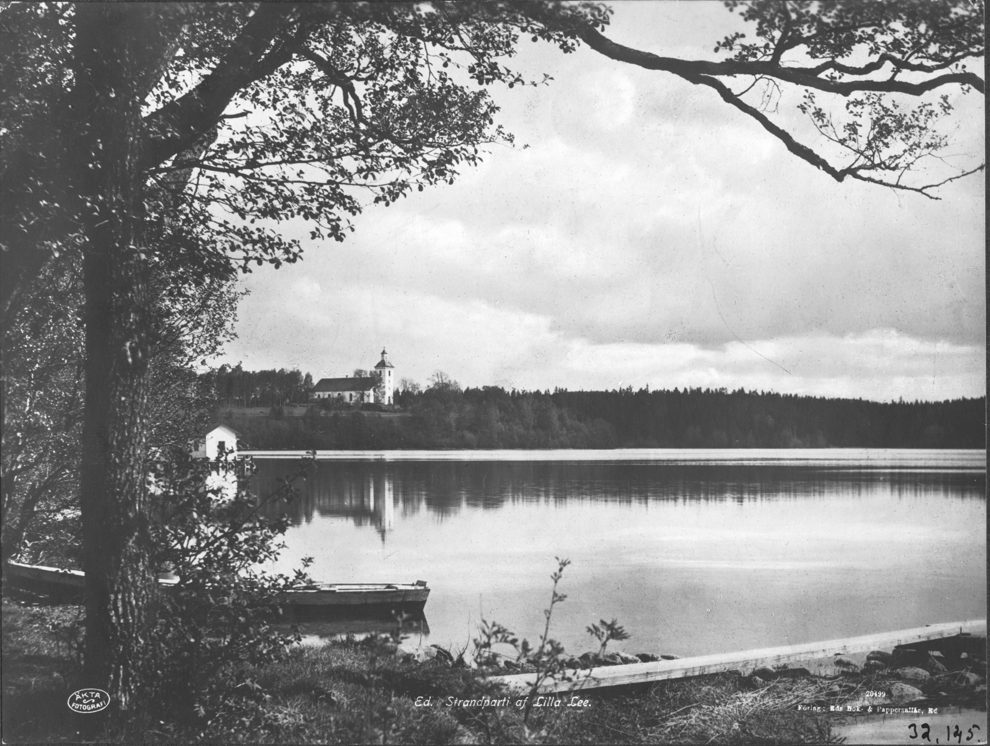 • Kyrkan och strandparti av sjön Lilla Le.