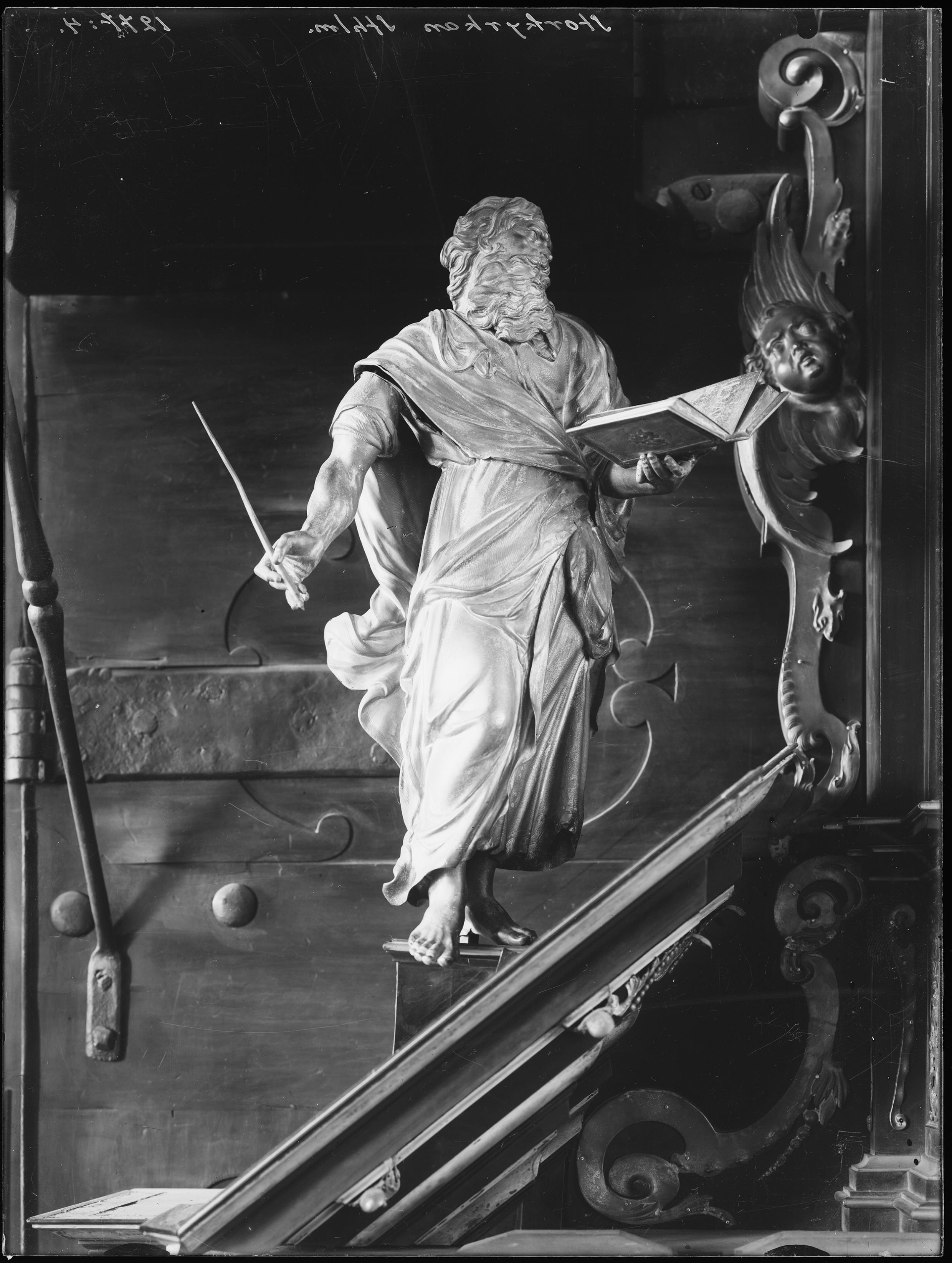 Retabel, "Silveraltaret", ursprungligen skänkt 1652-54, corpus mittparti, skulptur, evangelisten Matteus.