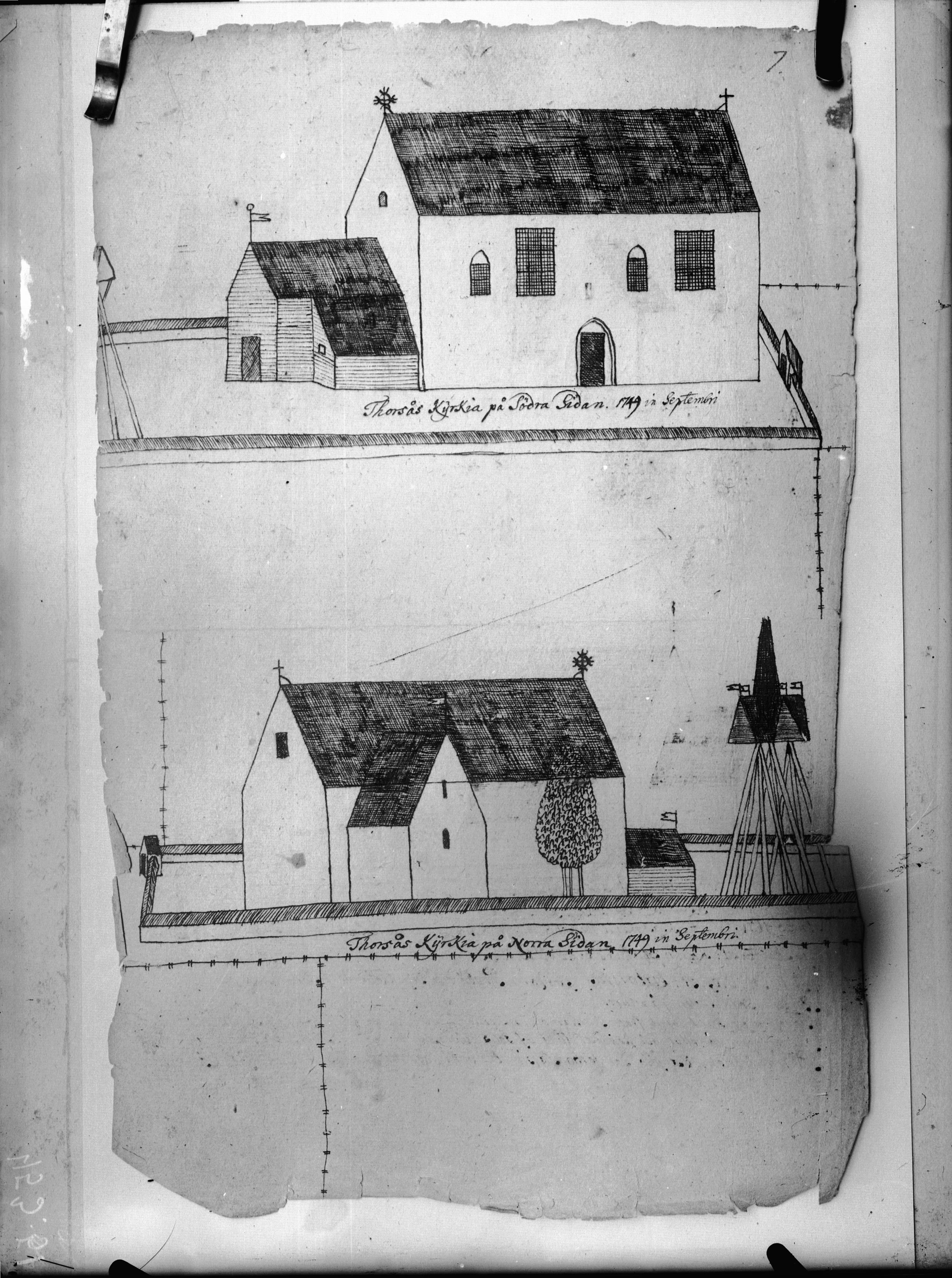 • Kyrkan mot söder och norr. Foto efter Frigelius, 1749, Kalmar läroverks bibliotek.