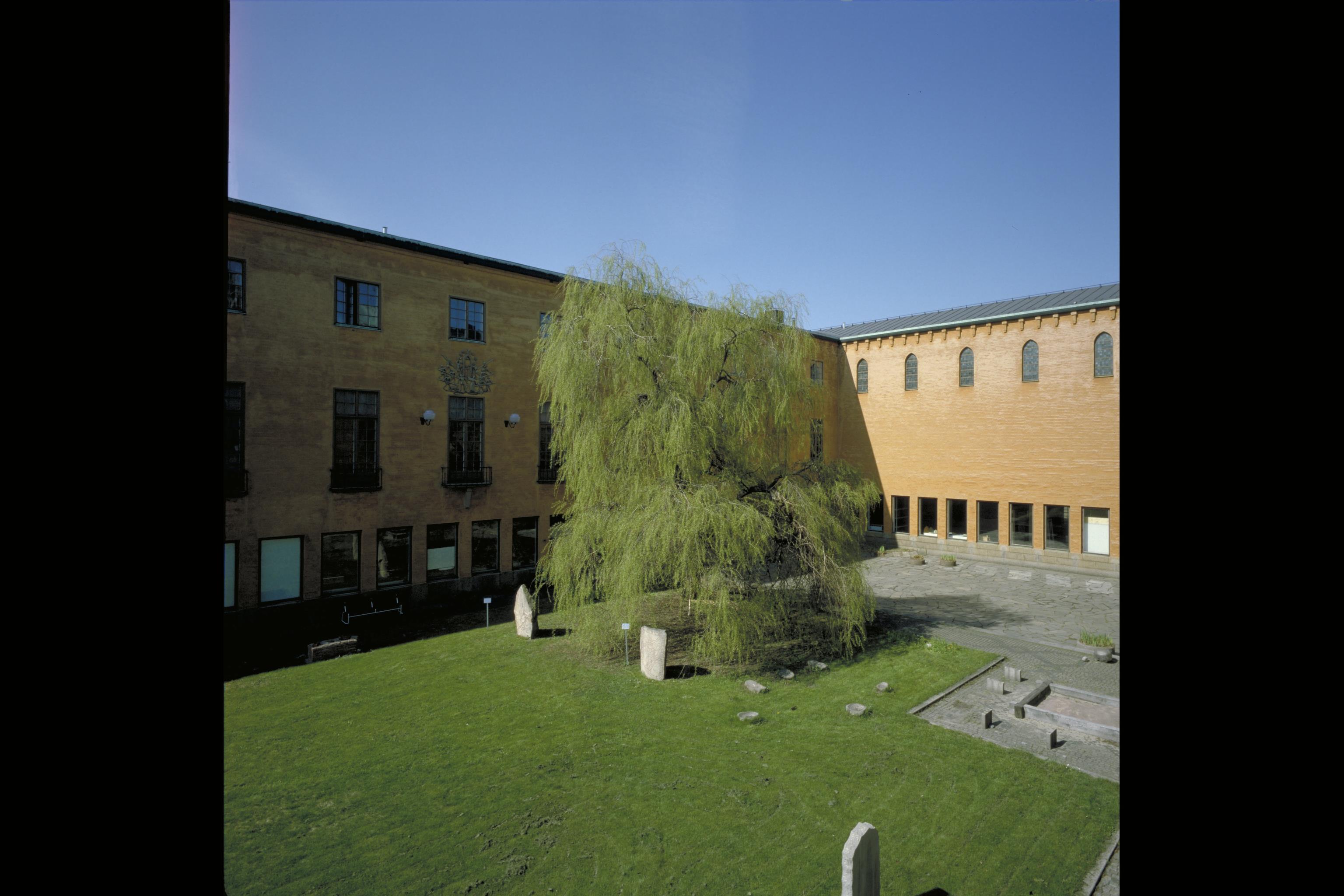 Kvarteret Krubban. Runstenarna U613 och U614 (från Torsätra, Västra Ryds sn i Uppland) på museets gård. Fotosyfte: Publicering