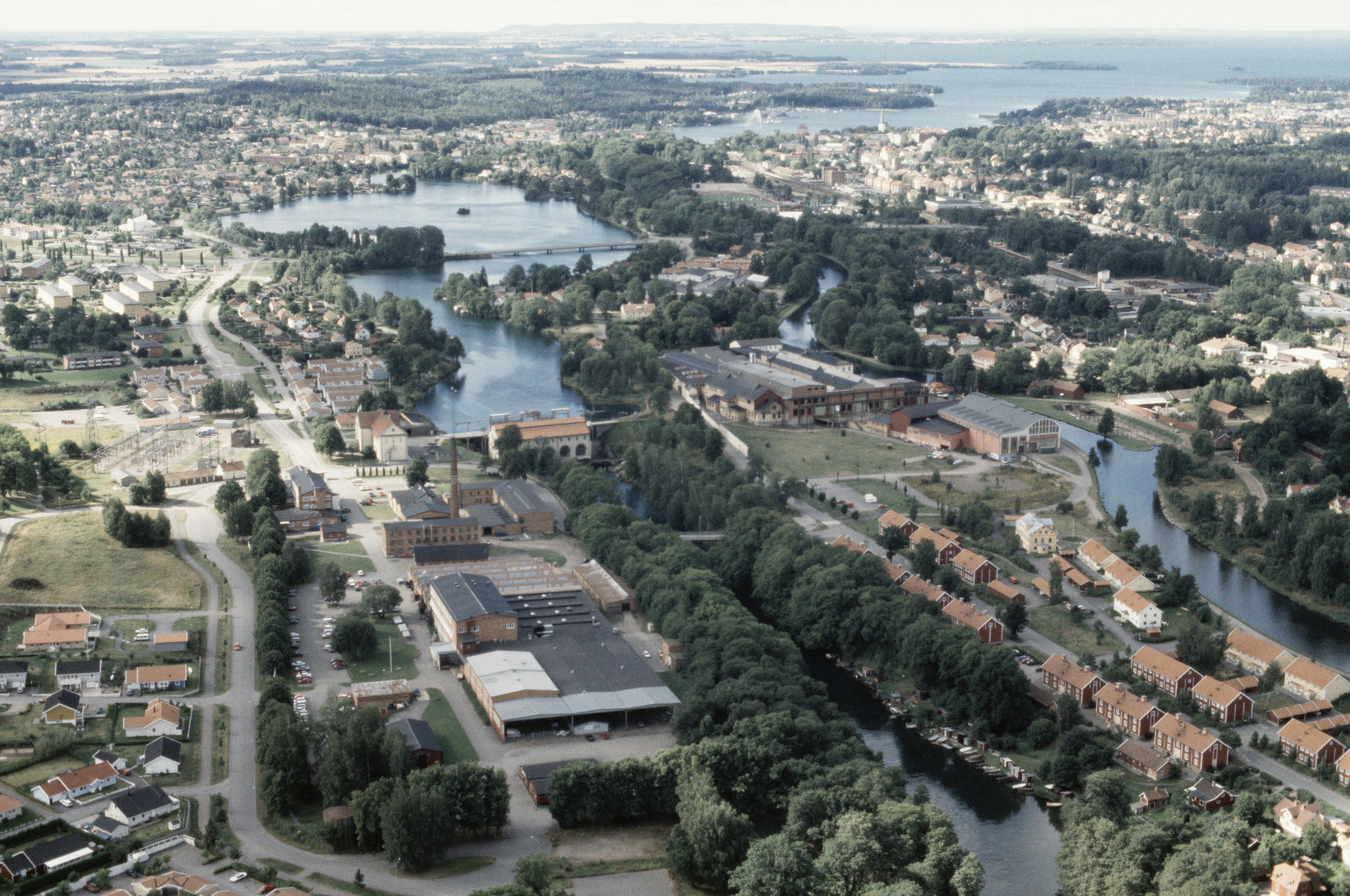 Motala ström och Göta kanal vid Motala tätort och sjön Vättern. Till vänster om bildens mitt Motala kraftverk. Till höger Verkstadsön och Motala verkstad m.fl. Över bildens mitt minnesmärke RAÄnr Motala 26:1. Bilden är tagen mot (väderstreck): SV Fotosyfte: Flygbildsdokumentation