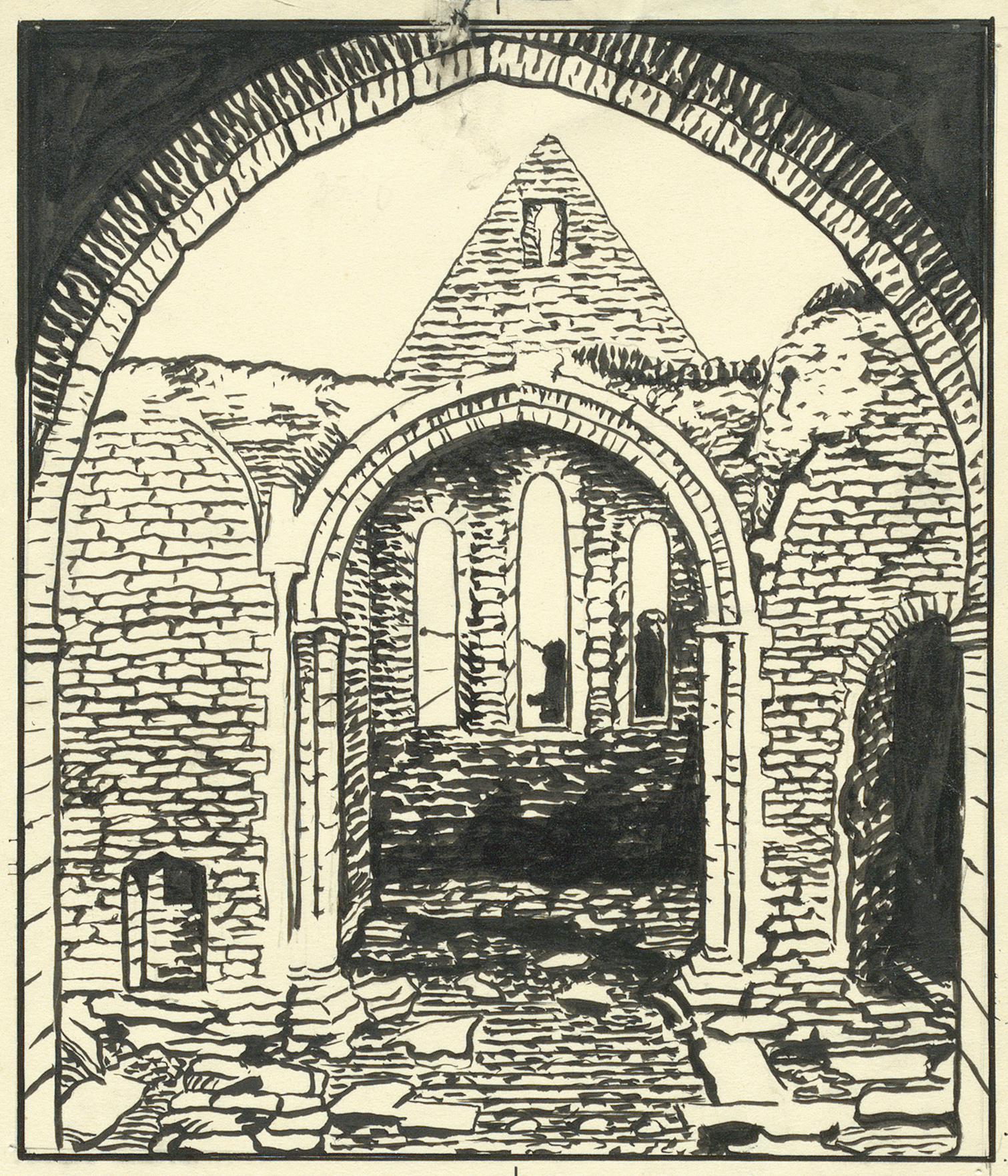 RAÄ-nummer Visby 56:1. Interiör mot koret. Tuschteckning av okänd konstnär Fotosyfte: