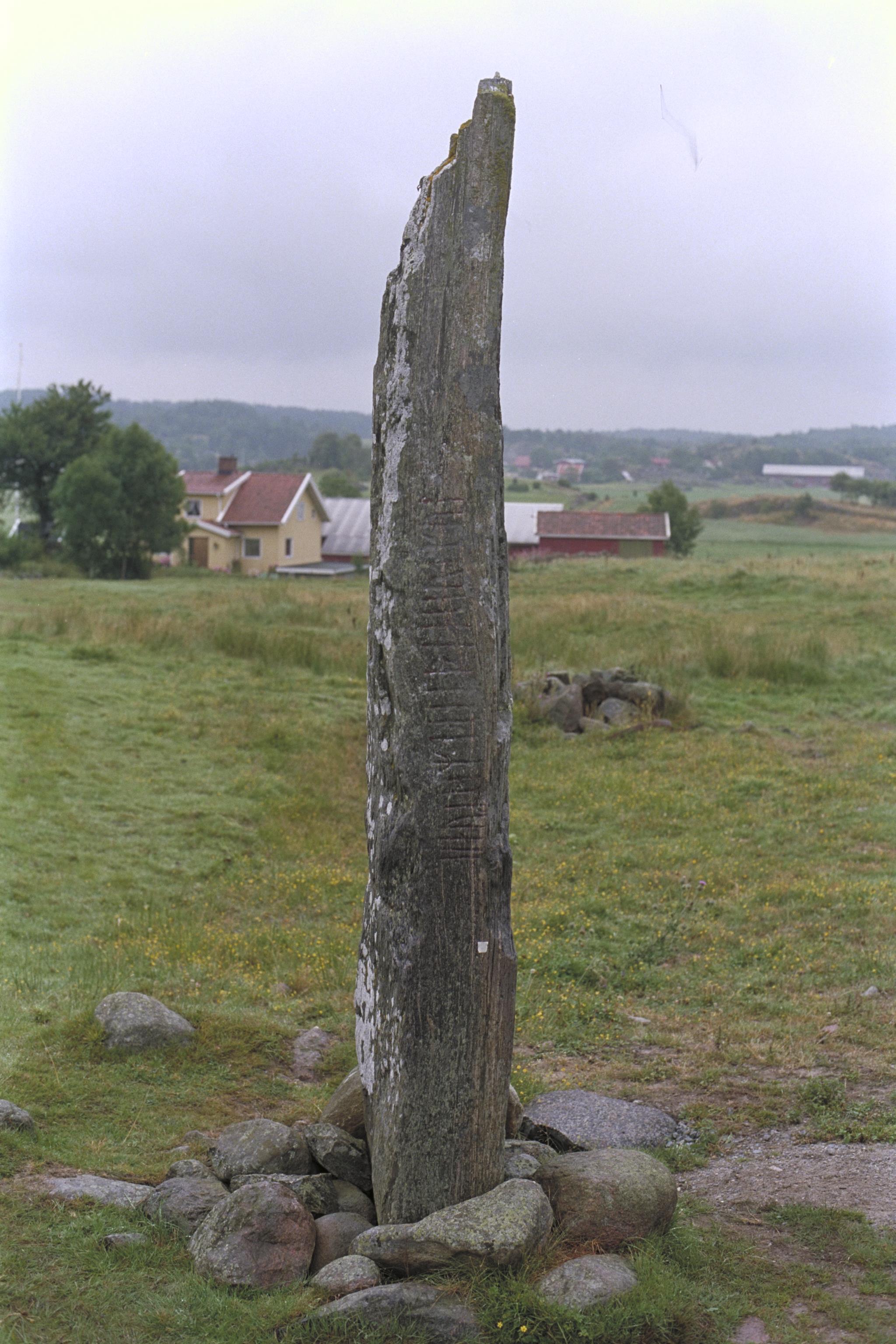 Stenen står öppet beläget i en hästhage, ca 100 m V om väg 160 på Orust ca 2 km NO om Stala kyrka. En knappt framkomlig väg leder förbi platsen. Mulet med begynnande regn. Bef. Ljus kombinerat med bouncerblixt. Fototid ca 2 tim. Studioblixt med elförsörjning, stege med ca 4 trappsteg. Införlivades i Runskadeprojektet år 2000. Den 250 cm höga stenen har en kort runtext endast på V smalsida. Om tolkningen se Lena Peterson i Blandande runstudier (1992), s. 81ff.