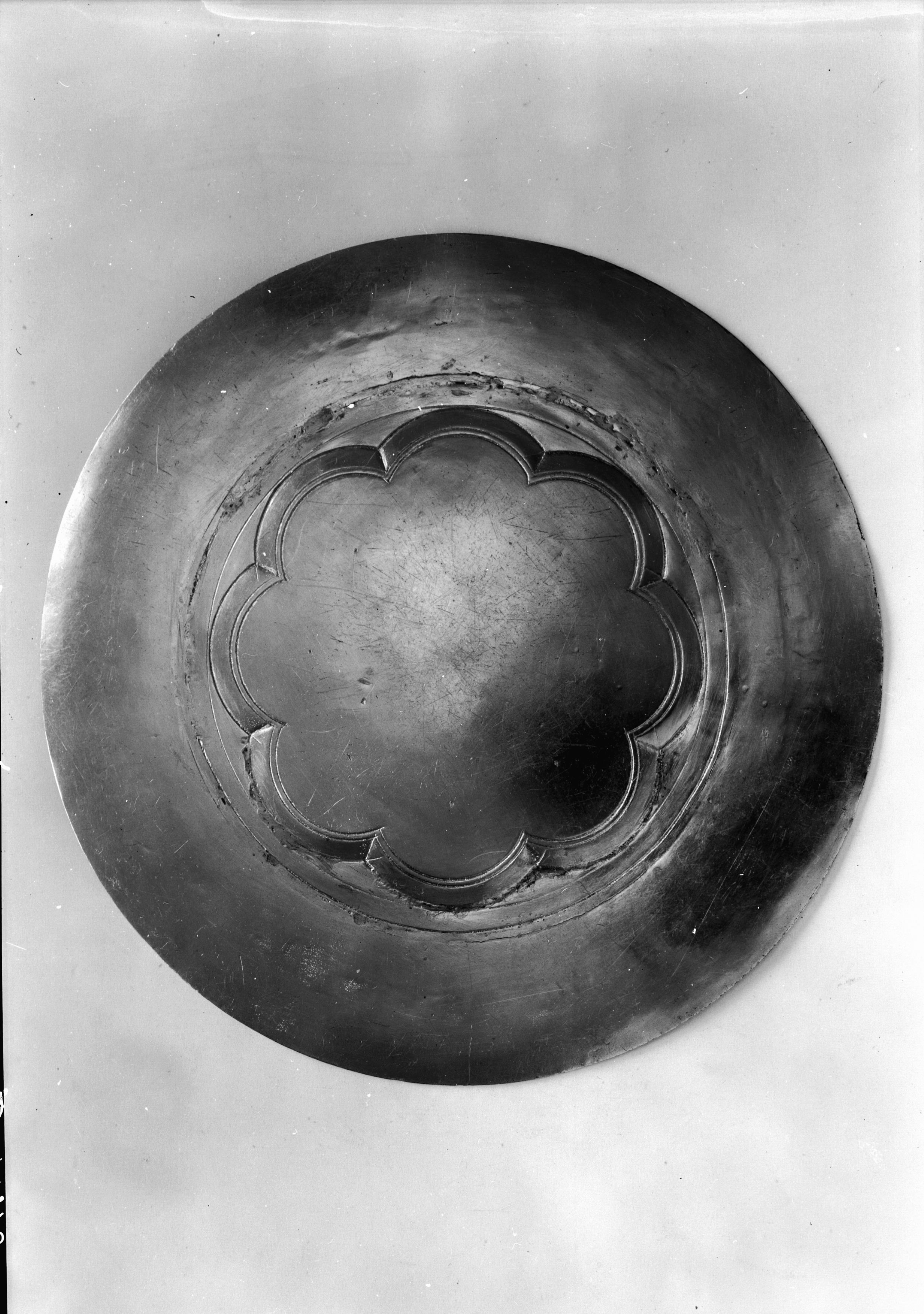 • Patén av silver, heltförgylld, medeltida. Undersida.