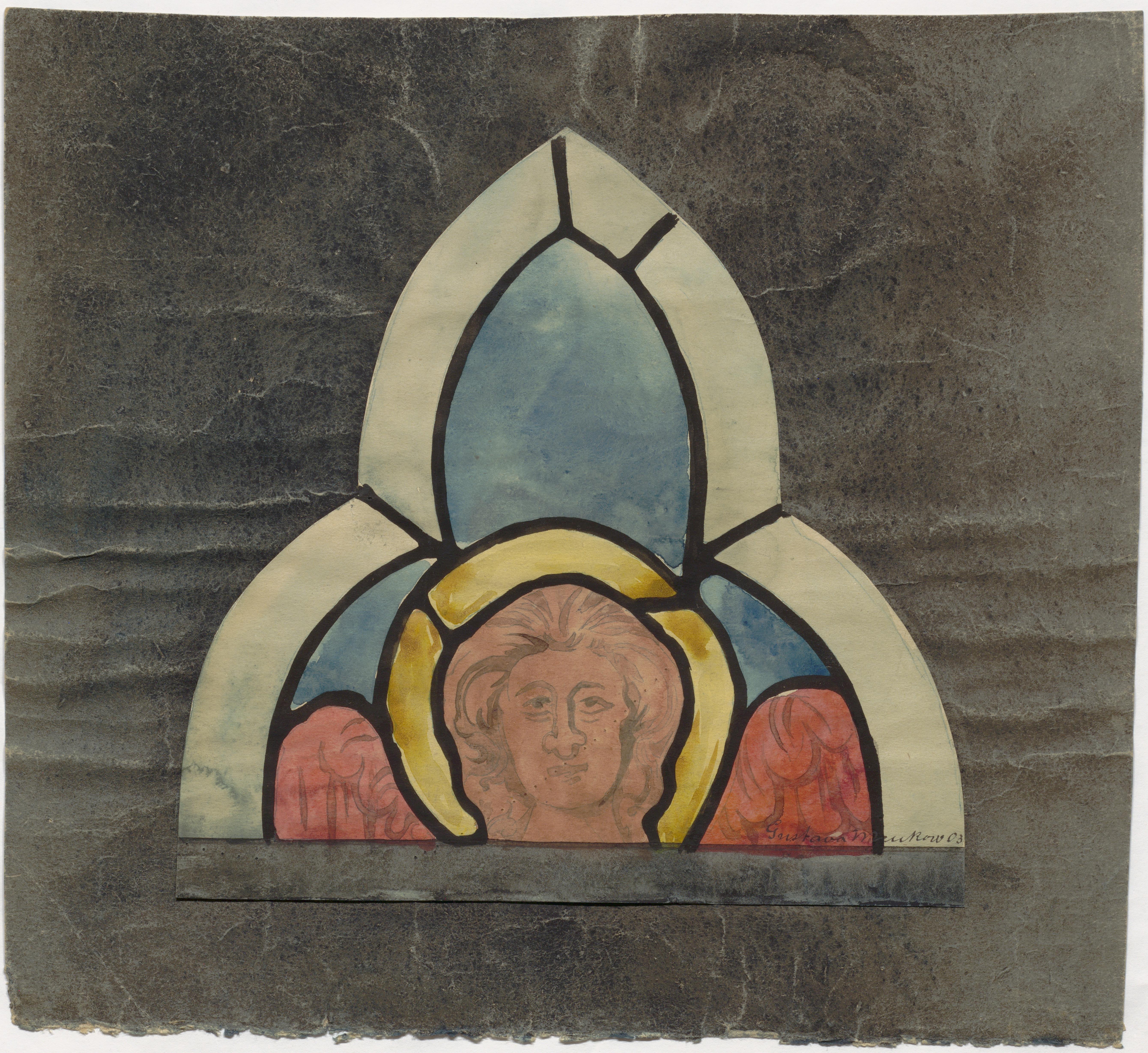 • Ängel i korets östfönster. Medeltida glasmålning. Akvarell av Gustava Meukow, 1903.