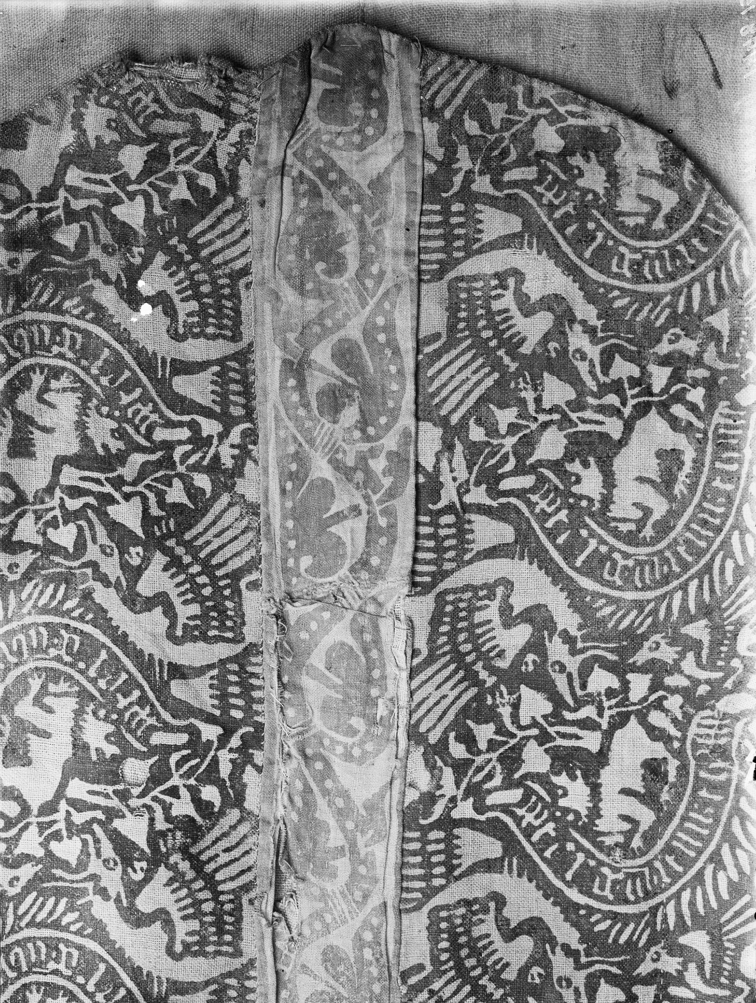 • Mässhake med svart tygtryck samt rankbård i rött tryck på framsidan, omkring 1400. Detalj av framsida.