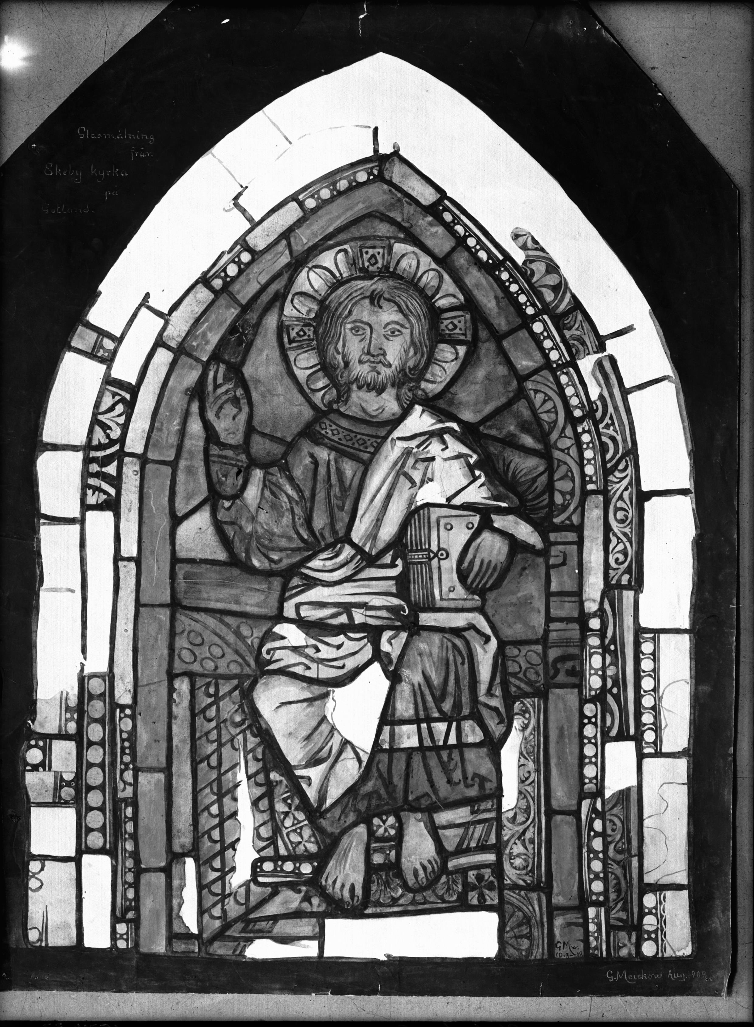 • Detalj av glasmålning. I korets och långhusets sydfönster. Medeltida. Foto efter akvarell av Gustava Meukow i ATA.