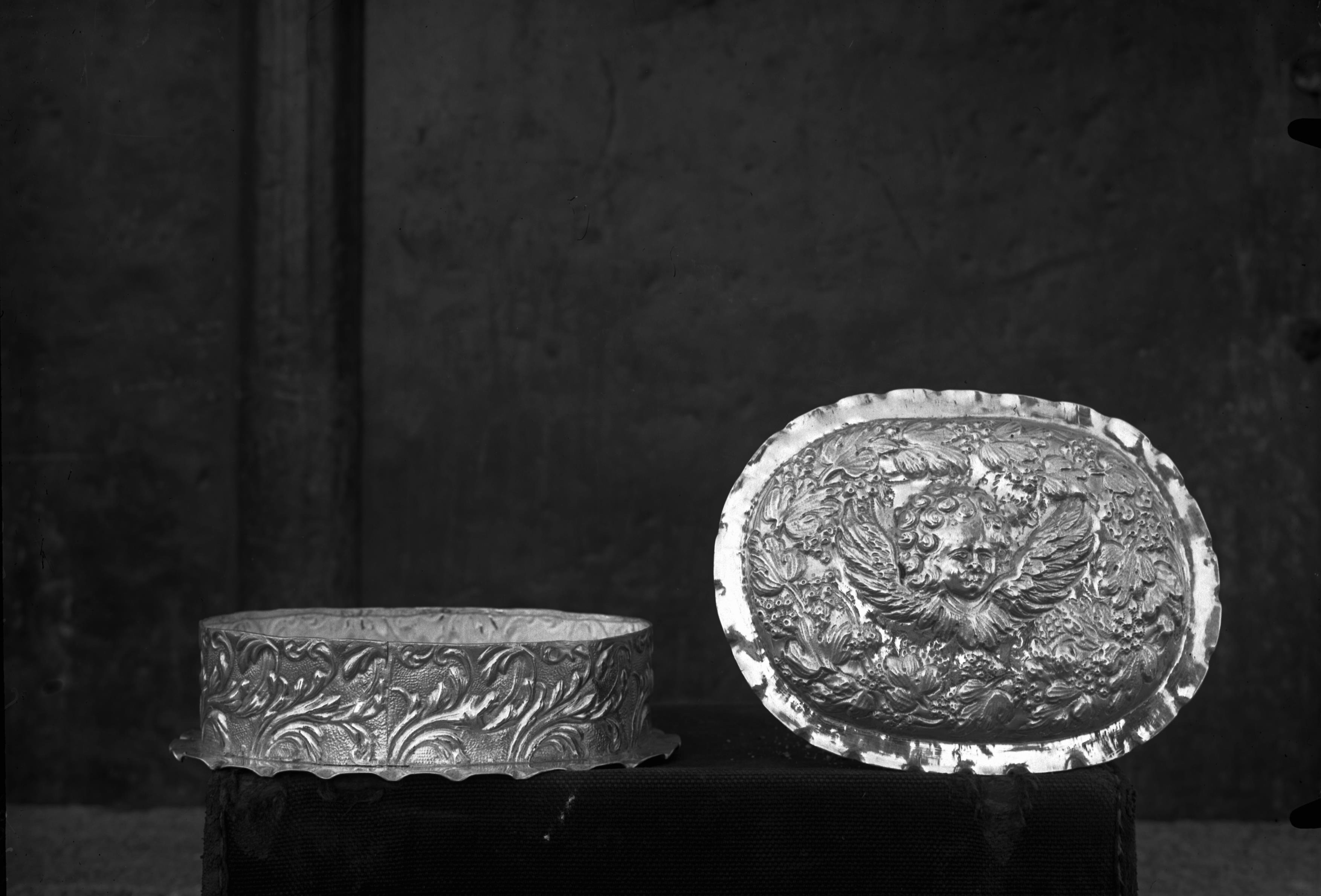 • Oblatask, mässing, försilvrad, oval med drivna bladornament och ett änglahuvud. Snabbinv.