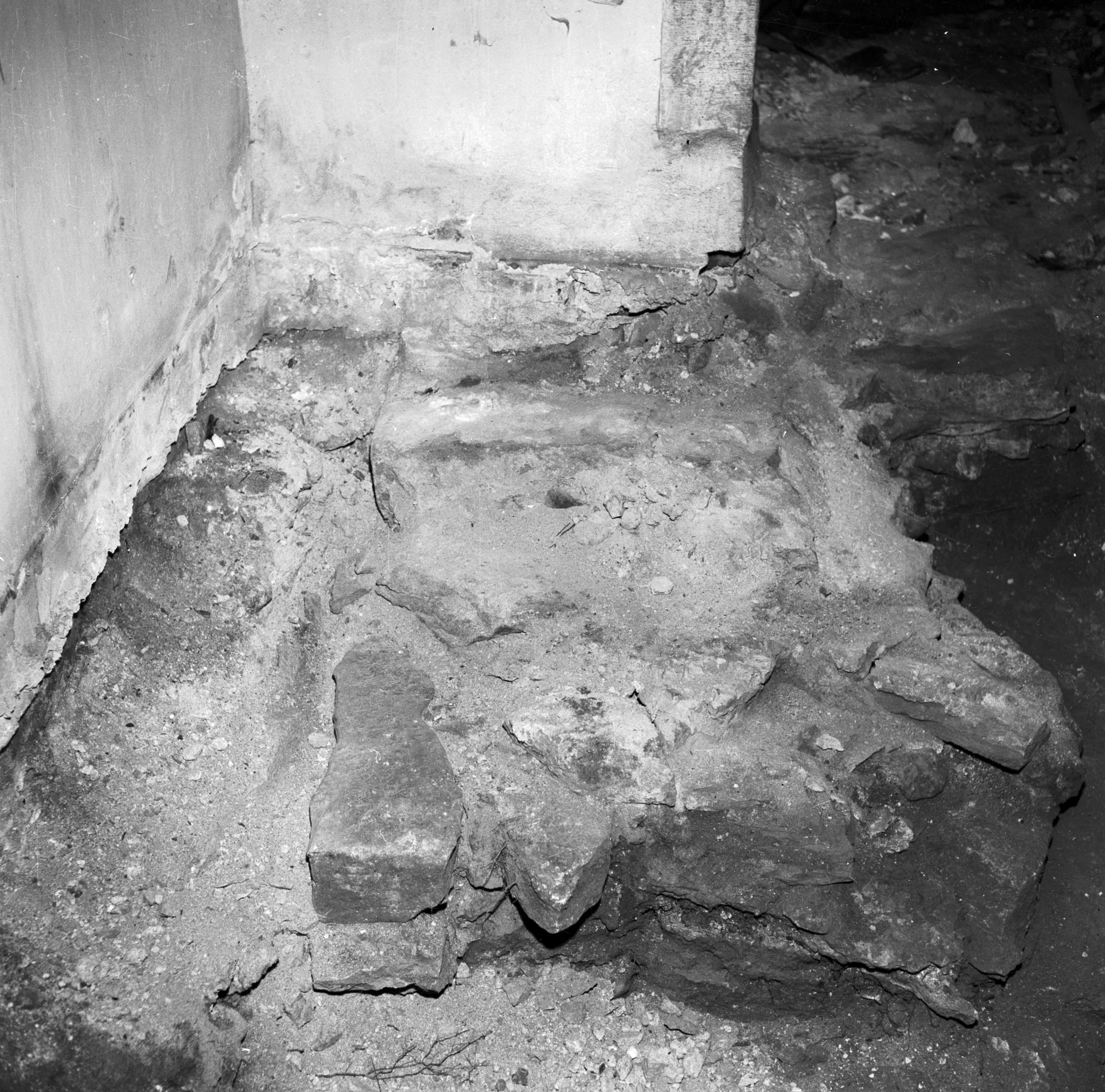 • Det romanska korets södra murs avslutning åt öster. Till vänster nuvarande korets södra vägg, i bakgrunden triumfbågens södra sida.