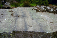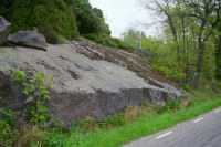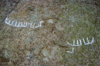 Hällristning, 3,4x3,3 m (Ö-V), bestående av 2 skepp, 1 fragment, 1 avlång fördjupning och 15 skålgropar. Skeppen är 33-48 cm l, enkellinjetyp med bemanning. Fragmentet är 10 cm l. Avlånga fördjupningen är 10x5 cm stor och 1 cm dj. Skålgroparna är 2,5-5,5 cm diam och 0,3-0,8 cm dj. Belägen på starkt S-sluttande berghäll mot väg, invid sprängkant. (Raä dnr: 326-3199-2009) - - Äldre beskrivning: Hä...