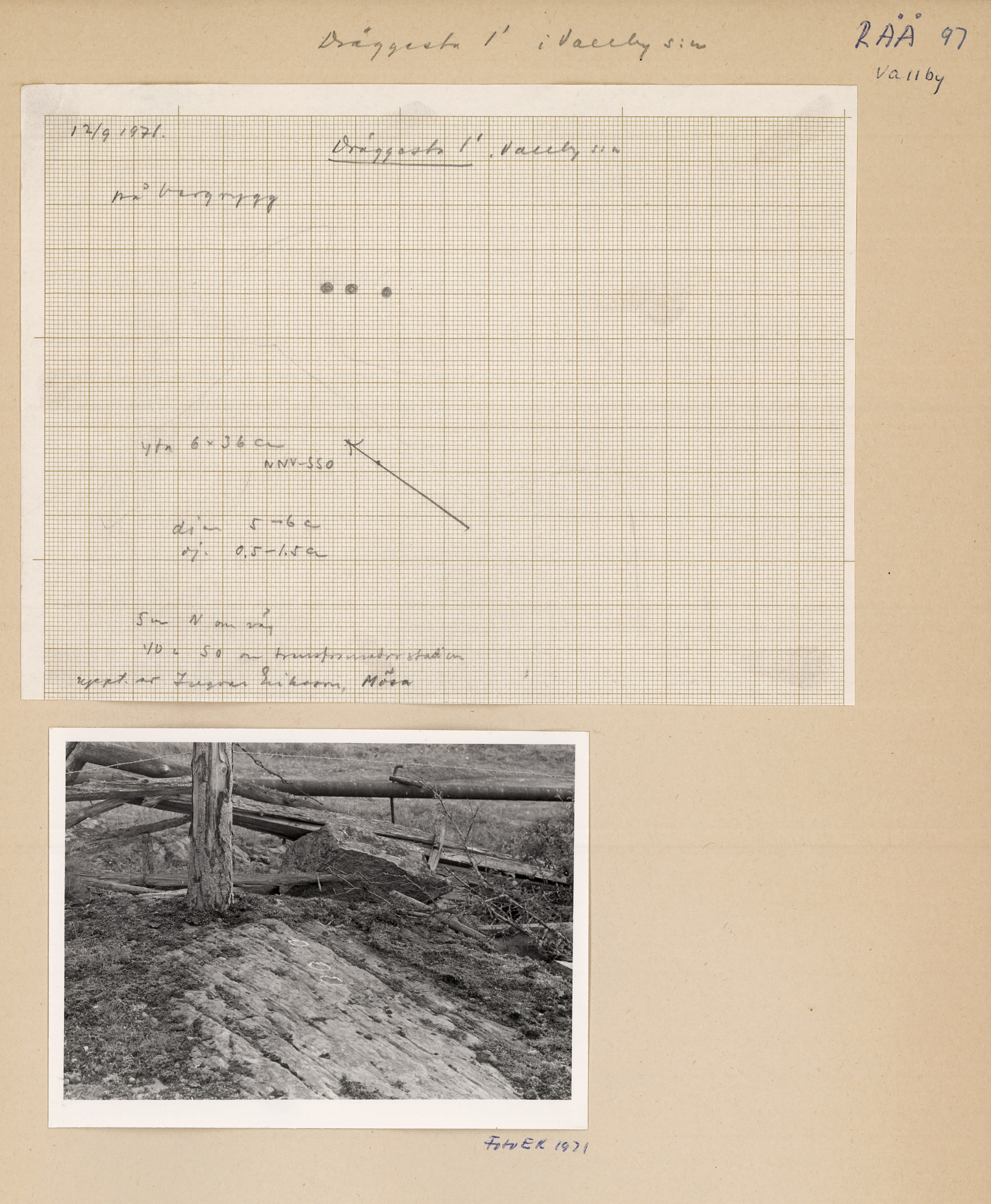 Älvkvarnsförekomst 0,36x0,06 m (NNV-SSÖ) med 3 älvkvarnar 5-6 cmi diam och 0,5-1,5 cm dj. I mindre bergrygg. Impediment utmed väg. 240 m ÖSÖ om manbyggnaden på Dräggesta 1:1, 5 m N om väg och 40 m SÖ ...
