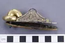 • svärdsknapp med rik vendeltida dekor och förgyllning. svärdsring och en nit.