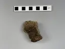 • Fragment av kärl med fast magring. Mörkbrun, grovt rabbig yta och skrovlig insida. Ingen synlig dekor.
