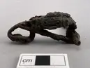 • fibula med lång spiral som avslutas av en knopp i ena änden. enda delen av spiralen saknas. omvikt fot. bandformig båge omsluten av en dekorerad bronsplatta. Hör troligen till grav 13