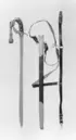 Balja av svärtat läder beslagen med munbleck och doppsko av reliefornerad förgylld mässing. Munbleck, 179 mm högt, med dekor i form av bladranka mot punsad botten. Utmed överkanten urtag för styrskenan samt 62 mm från överkanten på fram- och baksidan med hållare med koppelringar. I dessa fäst bärremmar av svärtat läder med spännen av silver. Doppsko, 237 mm hög, med lika dekor som den på munblecket. Släpsko högre framtill än baktill.