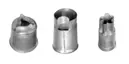 • LEGYMFORMARE, tre stycken Av bleckplåt. Den ena svagt konisk, med mynning i form av en i profil sedd blomma; kring övre kanten en smal stav. Höjd: 3,5 cm.; diameter: 3 cm. Den andra cylindrisk, med mynning i form av en halvmåne, övre kanten snett utstående. Höjd: 4 cm.; diameter: 2,8 cm. Den tredje med övre delen cylindrisk, den nedre veckad i fem runda veck. Höjd: 4,4 cm.; diameter: 1,8 cm.