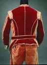 Modellen når precis över knät, har lucka fram och 6 fickor. Byxan har idag två sorters rödfärgad sammet. Linningen i en mer röd lila sammetoch benen i en blekare gulröd sammet som verkar äldre än linningen jfrde övriga plaggen till denna dräkt. Frambyxan är slät mot linningen och bakbyxan ökar i längd och vidd motmitten bak så att den är kraftigt rynkad mot linningen längs med helabakbyxan. Linningen är ganska rakt skuren upptill men bredare fram såatt den ökar i vidd nedåt och framåt. Linningen knäpps med fyraknappar, klädda i sammet, nr tre uppifrån i ljusare sammet. Högralinningen har lagts ut mitt fram. Spår syns där knappraden tidigaresuttit och själva byxan når inte till linningens bredd under luckan.Linningen är skarvad mitt bak. Spänntampen bak sitter på högrabyxdelen och den har flyttats ut. Knapphål finns på motsvarande sidapå vänster byxben, knapp saknas. På linningen finns två biljettfickor med vilande stolpar och småfickpåsar i ljust siden. I skarven mellan linning och byxa finns tvådjupa fickor med fickpåsar i ljust sidentaft. Dessa fickor kanknäppas, snedställda knapphål i hörnen. I sidsömmarna slutligen tvålånga fickor som kan knäppas med en liten klädd knapp. Samma fickfoderi alla fickorna. Luckan har sidor kantade med tyget, ovansidan är utan linning. Ihörnen snedställda knapphål, samt ett extra knapphål lodrätt mitt frampå luckan. Under fickorna mitt fram finns på vardera sida två liggande knapphål, ett mitt i skarven mellan linning och byxa, det undre 2 cm under detta Benen har ett sprund nedtill som knäpps med två knappar.Kanten nedtill är skodd med ett ripsband, ursprungligen rött eller rosa. Knappar: totalt 16 st, 8 st (22 mm) därav 3 st ljus sammet, 8 st (13 mm) därav 3 i ljussammet. Hela byxan är fodrad med ljust siden. Fläckigt i grenen. Fodret ärskarvat på vänster sida, men högra sidan har foder i ett stycke.