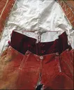Modellen når precis över knät, har lucka fram och 6 fickor. Byxan har idag två sorters rödfärgad sammet. Linningen i en mer röd lila sammetoch benen i en blekare gulröd sammet som verkar äldre än linningen jfrde övriga plaggen till denna dräkt. Frambyxan är slät mot linningen och bakbyxan ökar i längd och vidd motmitten bak så att den är kraftigt rynkad mot linningen längs med helabakbyxan. Linnin...