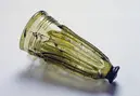 Gulgrönt glas med pålagda horisontella trådar och vertikala loopar.Fyra fragment är ej ihopklistrade med bägaren.