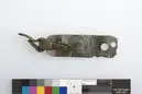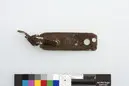 • rektangulärt med två hål i ena kanten och ett i andra. I det med ett hål rester av upphägningsanordning fäst genom hålet