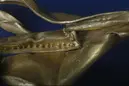Triangulära frontplattor som är dekorerad med granulation bestående av större korn vilande på en krets av mindre korn. Dekoren löper längs plattornas ylterkanter och det triangulära hålet i mitten. Själva ringdelen är gjord av en tunn ten som vridits i spiral. Hög silverhalt, vilket ger den en mattare lyster. Metallegering: 66,5 % guld, 31% silver och 2,5 % koppar (16 karat).