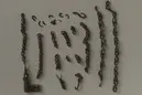 delar samt fragm av en el flera kedjor bestående av ögleformade länkar som bildar en närm triangulär kedja. 2 längre kedjedelar, 7,0+8,7 cm långa, 5 kortare delar, längd 1,4-2,5 cm samt 10 läsa fragm av länkar. samma typ som till nyckel m samma fyndn