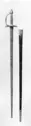 Fäste av försilvrad mässing med hög, profilerad nitknapp, hög, utdraget nötformig knapp med släta lister på fram- och bakkanten. Hjärtformig parerplåt, handbygeln fästad i knappen med uppvikt fot och genomgående skruv. Raka parerstänger, vidgade och vinkelformiga i ändarna. Kavel lindad med tvinnad, försilvrad mässingstråd, två tjockare samt mellan dem fyra tunnare. Klinga rak, tvåeggad med mötan...