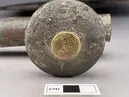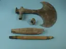 Ceremoninyxa, bestående av en tunn bronsskålla gjuten över en lerkärna. Den har bred, utsvängd egg och en trind skaftholk. Ändknopparnas knappar är försedda med en tunn, ringformig guldplatta, omgivande en röd sten. En kortare holk finns gjuten i ett med yxan. På sidorna kring övre kanten och på halsen finns koncentriska ornamenter. Träskaftet och bronsröret till skaftet är upphittade några år eft...Visa hela