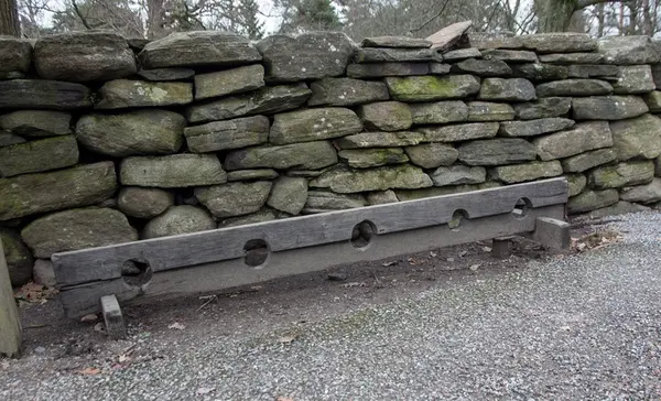 • Straffstock av omålat trä med fem hål. Hasp och äldre lås. Kopia av straffstock NM.0025659 från Ukna sn, Småland.