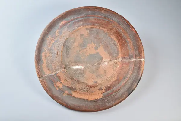Fat av lergods, lätt skålat, blyglaserat invändigt, engoberat i gulvitt med tulpandekor i brunt och grönt. Utmed kanten hemrad prickdekor. Utvändigt oglaserad. Glasyrbortfall, genomgående spricka.
