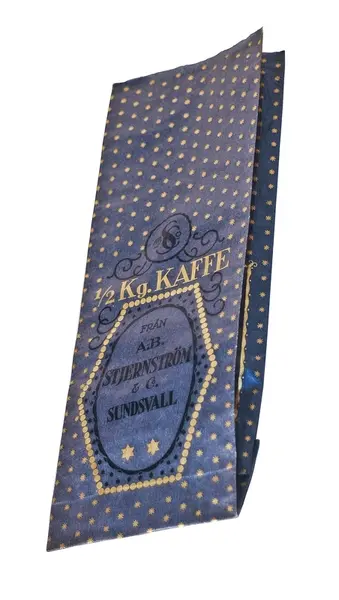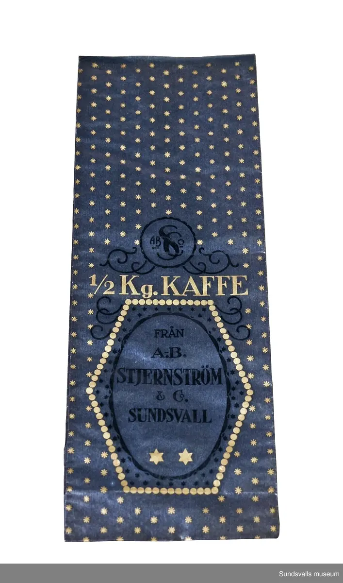SuM 4999:1-4 fyra kaffepåsar tillverkade i blått papper med text och dekorationer i mörkblått och guld. Påsen är fodrad med ljust papper. Texten på påsen lyder '1/2 Kg. KAFFE FRÅN A.-B. STJERNSTRÖM & Co SUNDSVALL'.