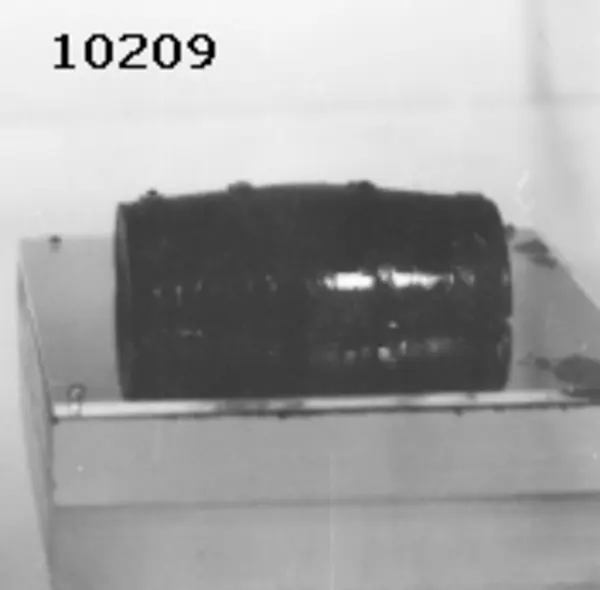 • Modell av tunn-boj. Tunna är försedd med fyra band. Svartmålad. Bojen är monterad på en träplatta. Botten och sidorna ljusgrå, översidan blå, täckt av ett plexiglas.