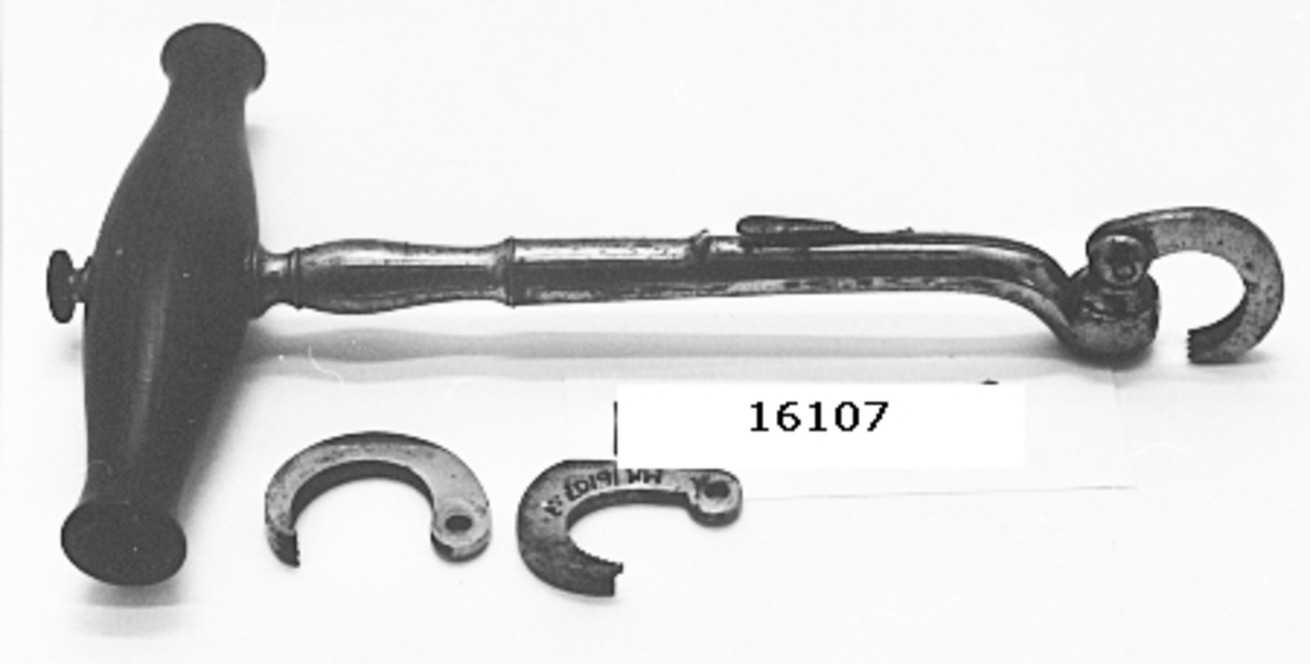 • Tandnyckel , profilsvarvad metallstång med vågrätt liggande svarvat trähandtag. I stångens nederdel en rörlig krok (utbytbar) med fyra hakar. Tillhörande två krokar.