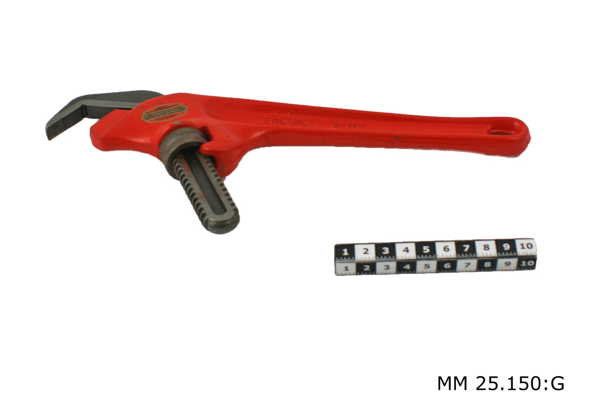 • Orange metallhandtag. I änden sitter en tångklo som kan öppnas och slutas med hjälp av en ställskruv. Märkning: "RIDGID R-110". På en klisterlapp text: "RIDGID FULL LIFETIME WARRANTY. If this housing ... Visa hela