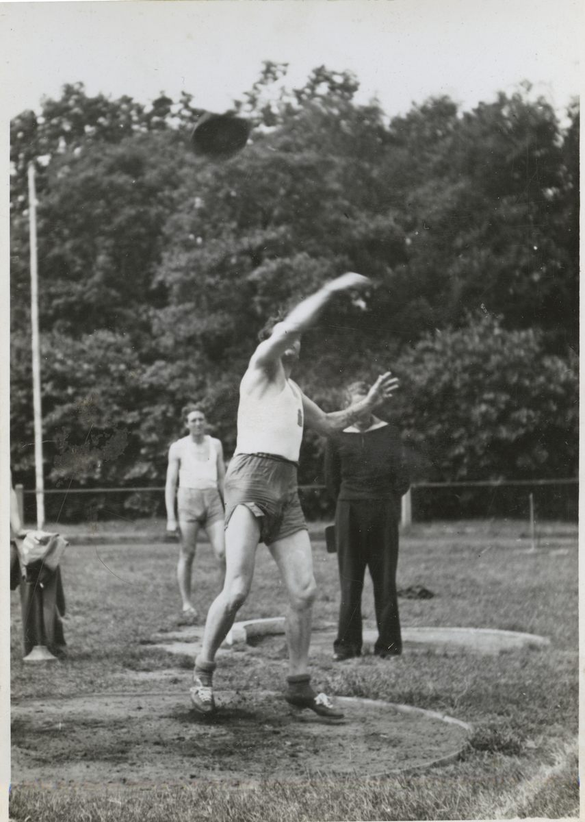 Man kastar iväg diskus. Två män står i bakgrunden och tittar på. Varav en bär sjömansuniform och den andre träningskläder.