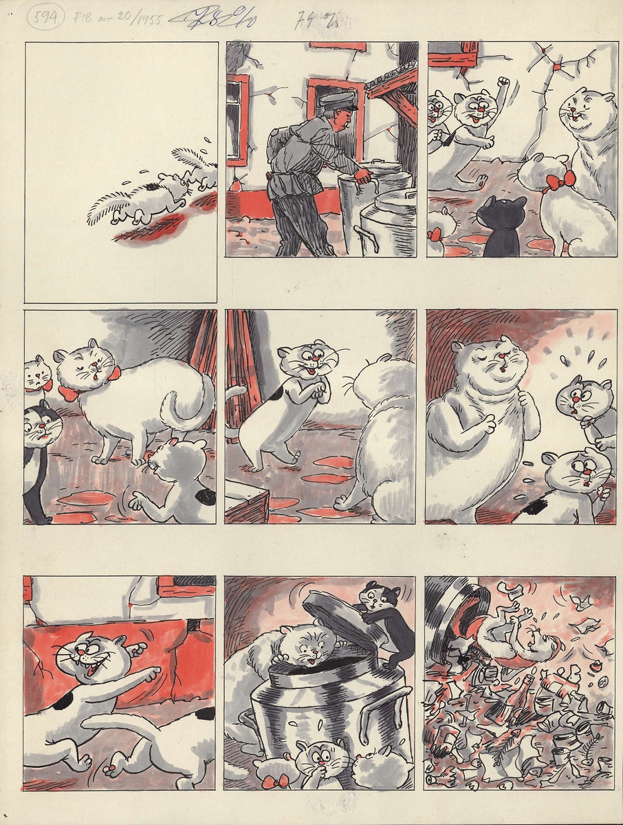 De nio teckningarna på arket har publicerats i tidskriften Folket i Bild nr 20 år 1955. De är illustrationer/serieteckningar till en av Gösta Knutssons berättelser om katten Pelle Svanslös. Konstnär...