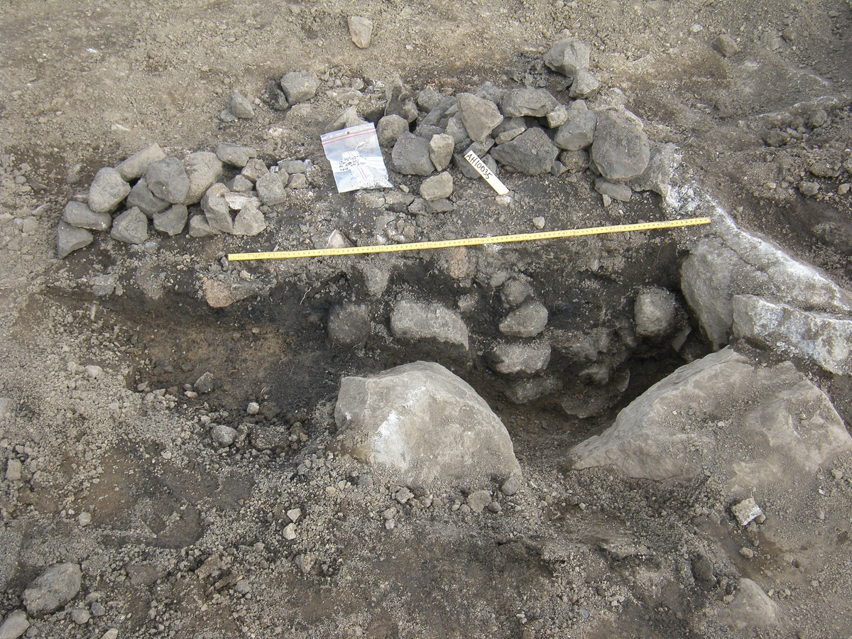 A15101 stolphål i hus 16, snittat (genom härd A10035), foto från söder