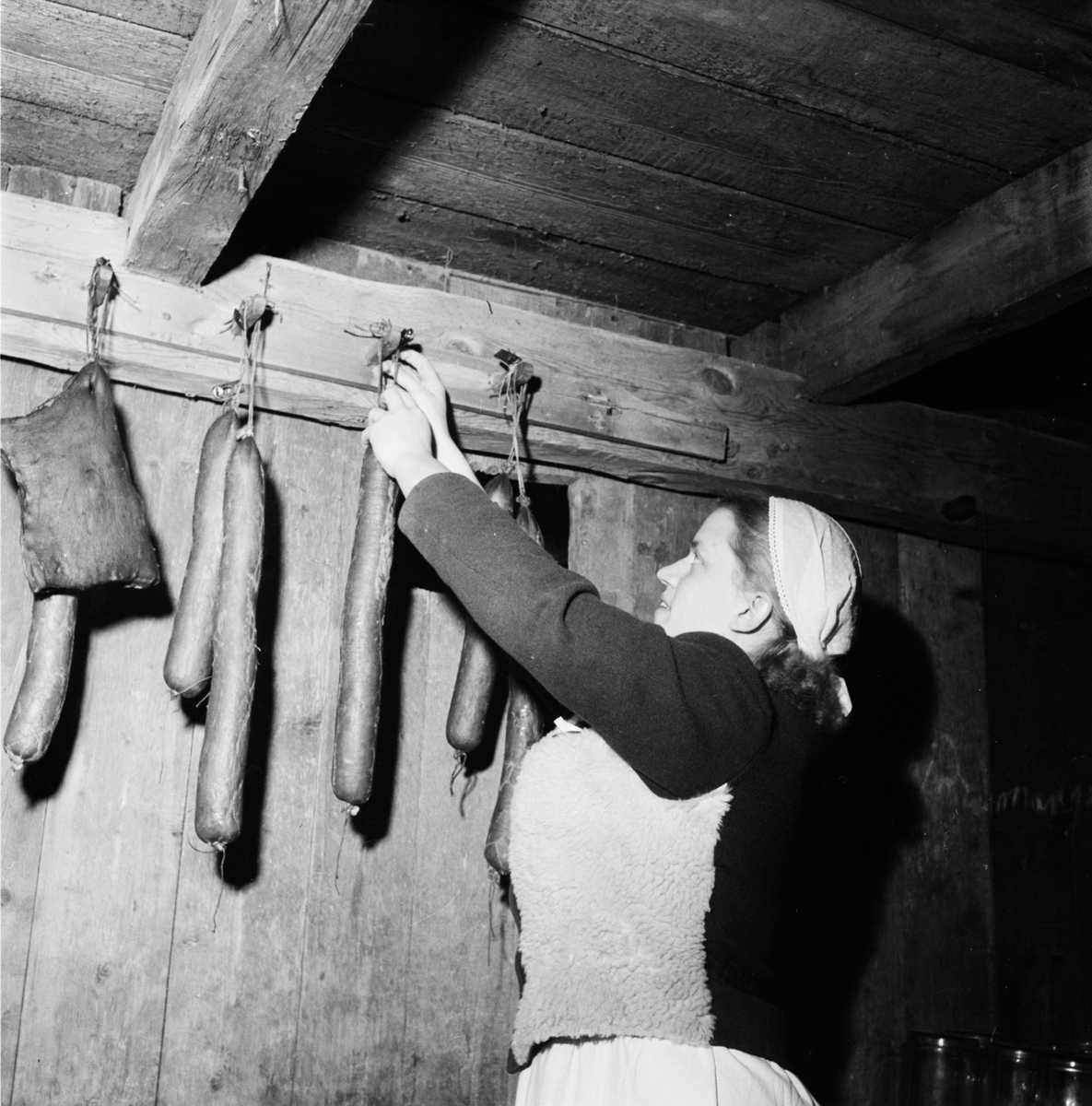 - Blivande lanthushållslärarinnan Millan Bengtsson hänge upp rökt korv i matboden, Eke gård, Vaksala