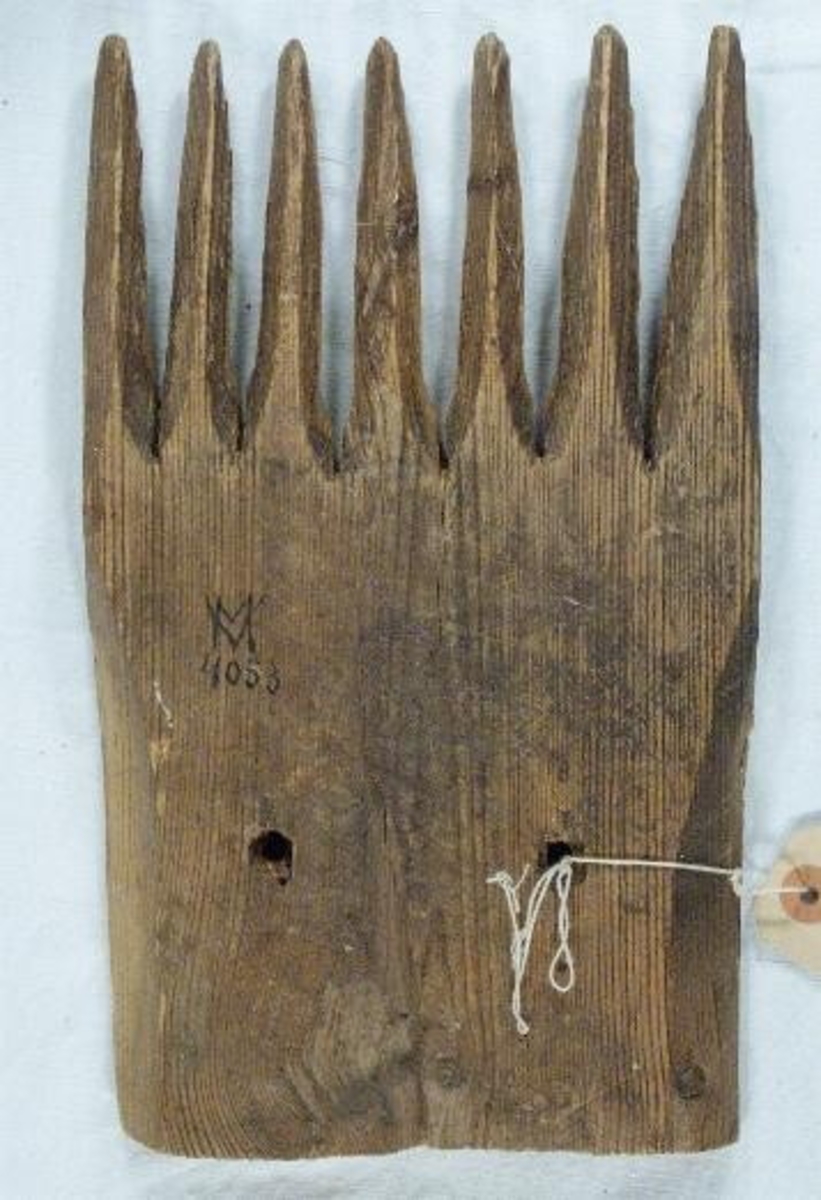 • Linrepa med kammar av trä att fästa i logväggen, från Håbol, Valbo, Dalsland.