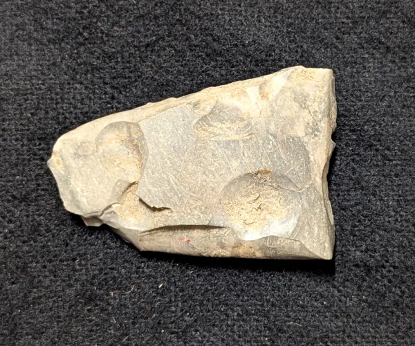 04 344:a-g. Fynd från Lerholmen, Hästefjorden, Frändefors socken. Dalsland. Gåva år 1910 av Thure Langer. f. Slipat flintredskap, fragment, 1 st. Ingår i en samling boplatsfynd VM04344 tillsammans med: a. Keramik, ornerad, 2 st. (Gropkeramik). b. Kölskrapa, 1 st. L. 6,2 cm. Bredd 2,6 cm. c. Mejsel, flinta, fragment, 1 st. Endast eggpartiet bevarat. Oslipat. L. 4,5 cm. Bredd 3 cm. d. Kärna, flin...